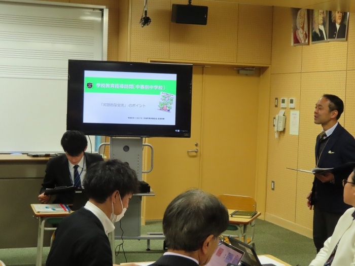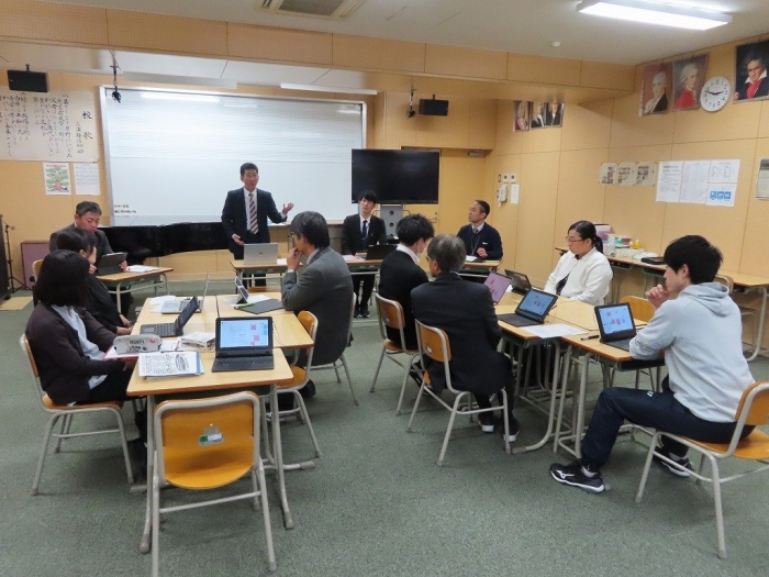 授業後に生徒の姿や授業の成果と課題について話し合い、参観していただいたお2人の先生方からご助言をいただきました。ありがとうございました。今回の研修を今後の指導に生かしていきます。