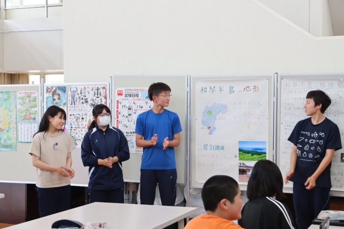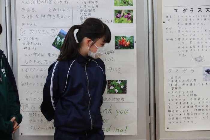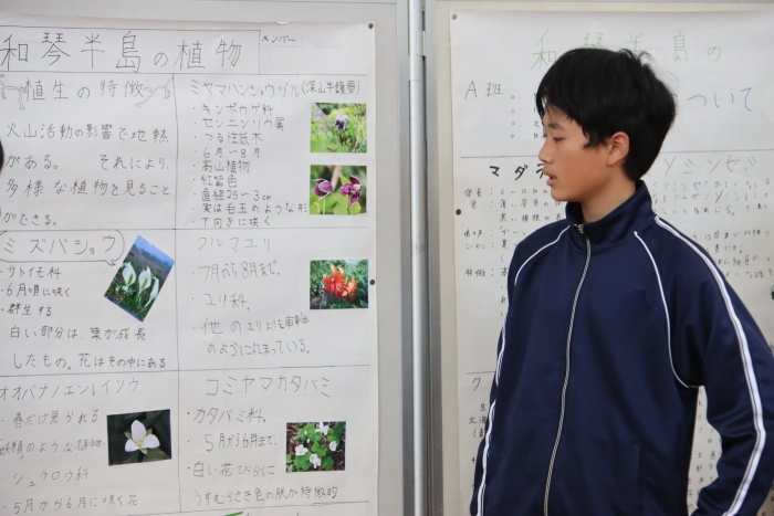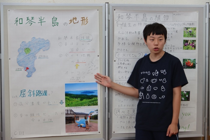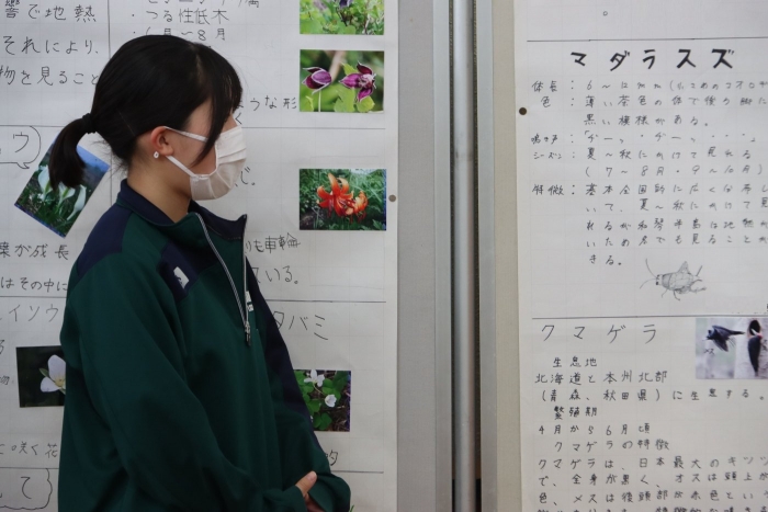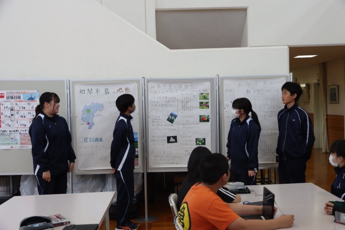 全校生徒を「動物」「植物」「地形」の三つのチームに分け、それぞれのテーマで調べた内容を模造紙にまとめる活動に取り組みました。