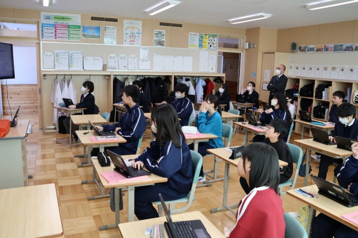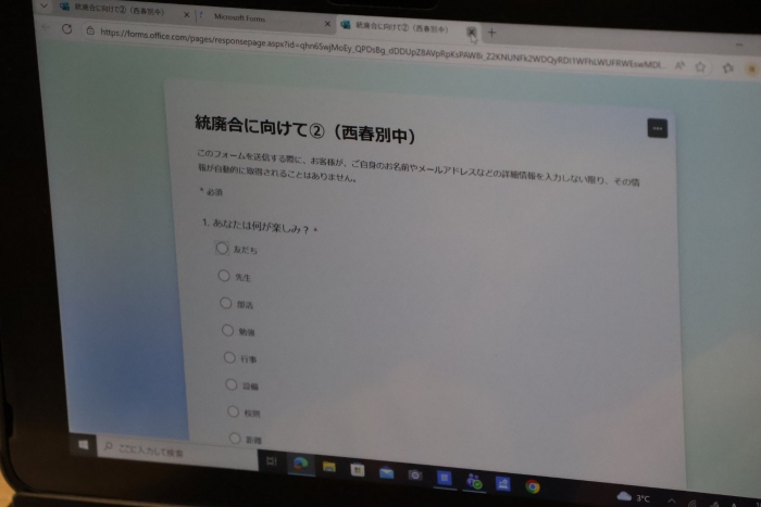 次年度から統合する上西春別中と西春別中の相互理解を深めるため、アイスブレイクを取り入れたり、タブレットでアンケートを集約しながら、統合後に楽しみにしていることや心配なことなどを共有しました。