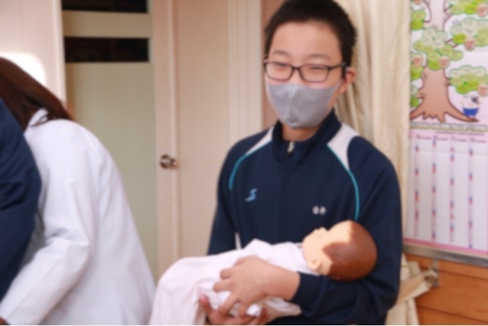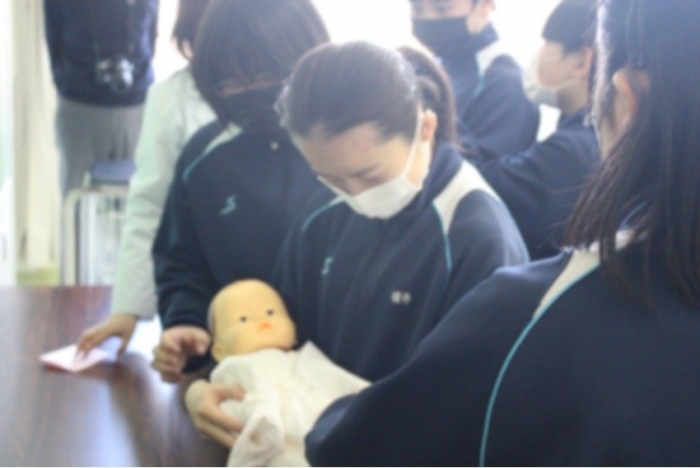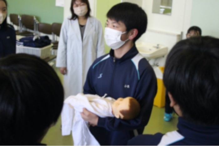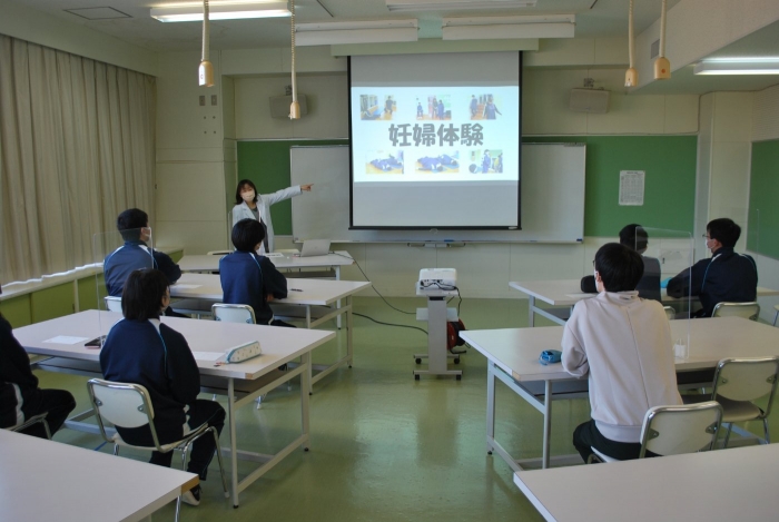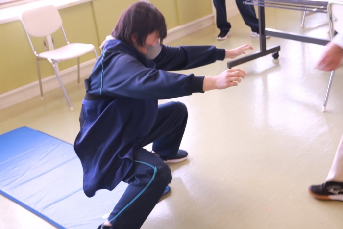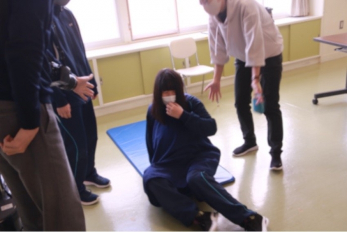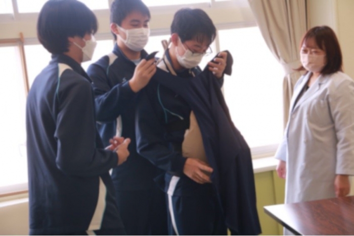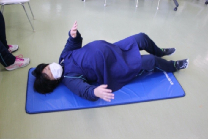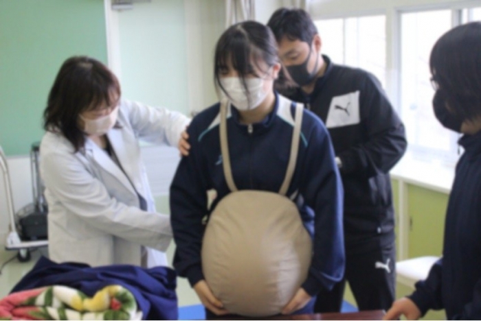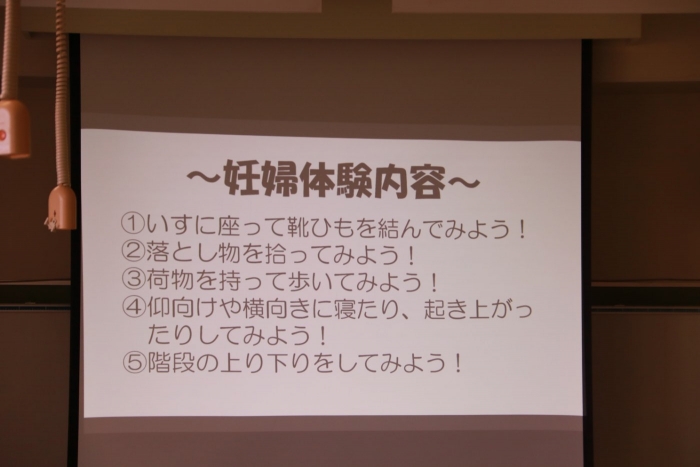 身体におもりをつけて、歩いたり、屈んだり、起き上がったりして妊婦さんの大変さを体験しました。