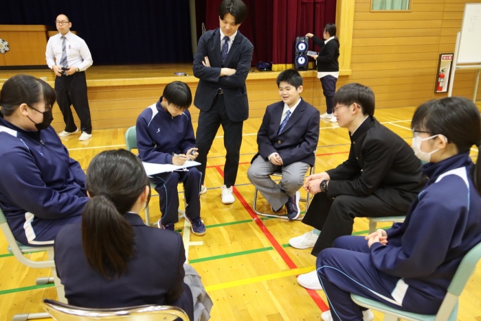 西春別中学校には現在バドミントン部しかありませんが、2,3年生の部員が実際にシャトルを打ち合ったり、練習メニューを伝えたり、部活のイメージがつかめやすい紹介となりました。