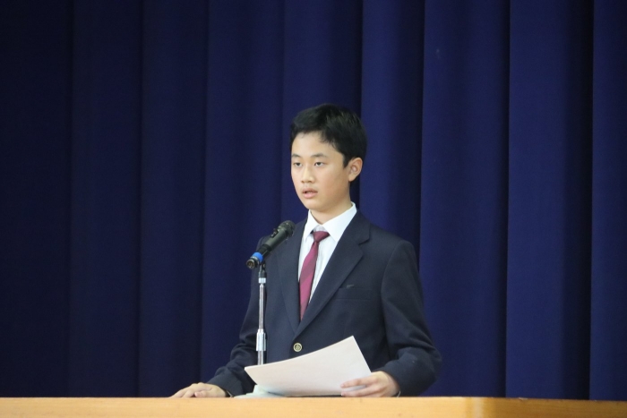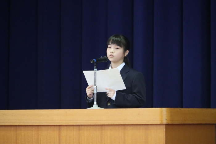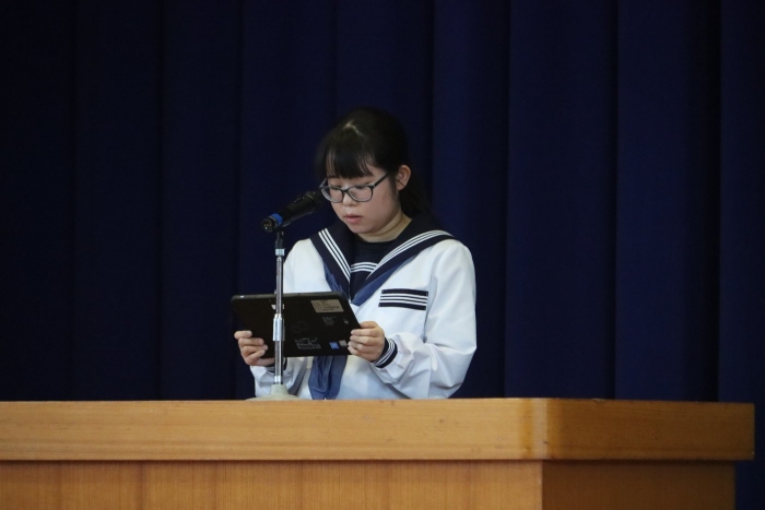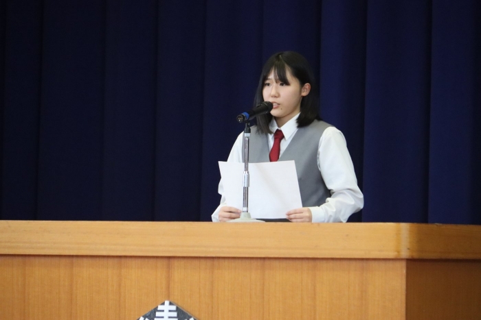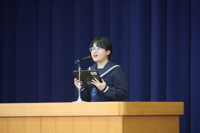 大規模校であれば、各クラスから代表者が選ばれて体育館などで発表するのが一般的ですが、本校は少人数校ならではの特色として、全校生徒が一人ひとり登壇し、講堂で自分の主張を発表します。