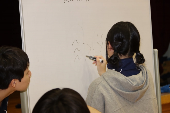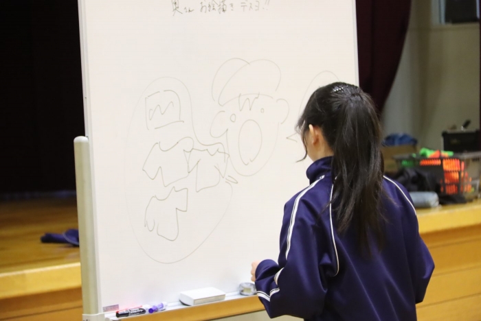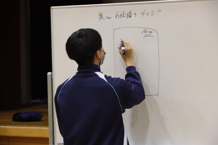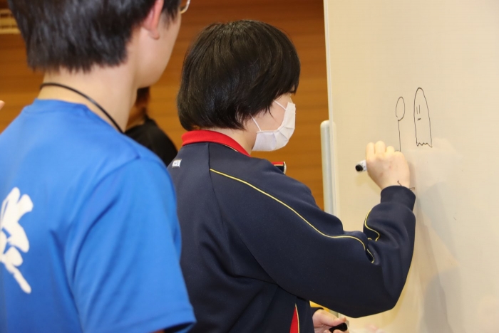 ホワイトボードに描かれた絵を見て答えるシンプルなゲームですが、数字や文字を書いてはいけない上に、絵にするのが難しいお題も多く、描く側はなかなか苦労していました。その分、「これ何だろう?」「やっと分かった!」と答えが出た瞬間の盛り上がりが大きく、会場は終始笑顔に包まれていました。