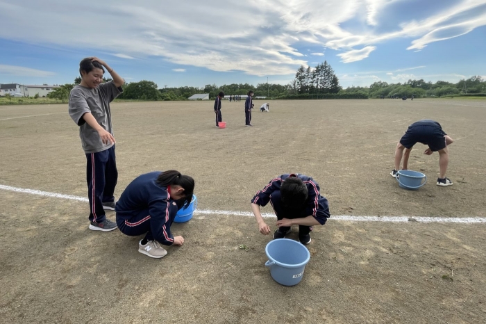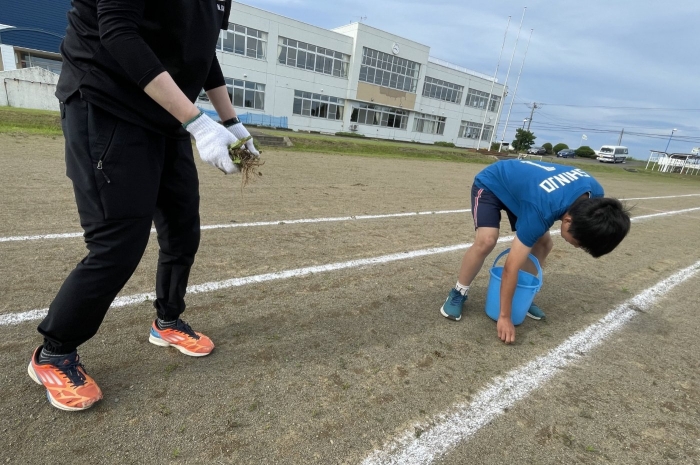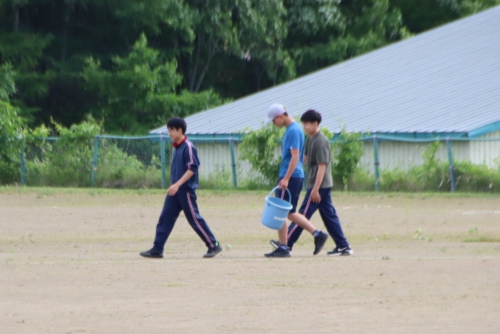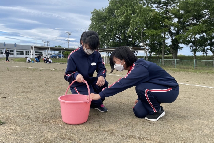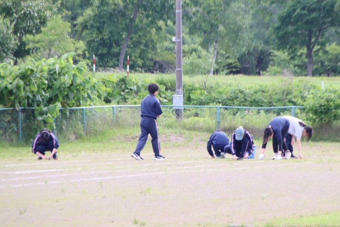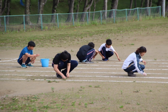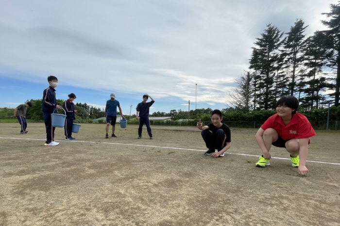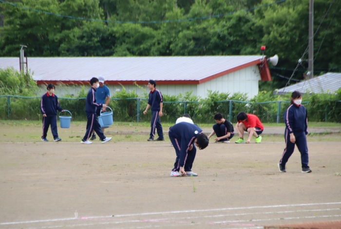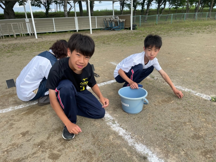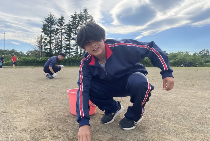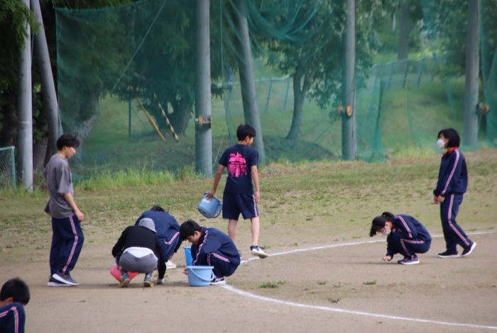 グラウンド石拾い 2024年07月03日(水) 日々のできごと ※7月3日(水)作成 放課後にボランティアを募り、体育祭前のグラウンドの石拾いをしました。部活動があるにもかかわらず、時間ギリギリまでたくさんの生徒が作業を手伝ってくれました。 選手たちが走る100mのコースや200Ⅿトラック中心に15分間という短い時間でしたが、ボランティアの子どもたちはたくさんの石を拾ってくれました。