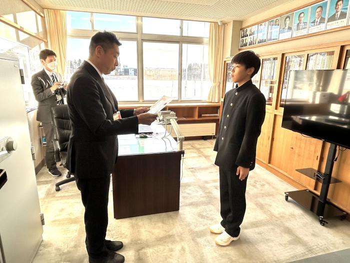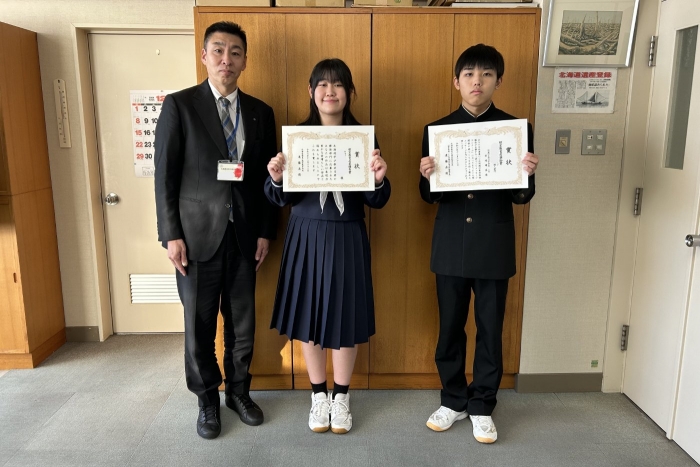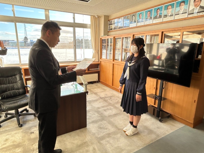 教育局長からは「お二人の作品はとてもレベルが高く、素晴らしいものなので、ぜひこのメッセージ・標語を根室の教育に活用させていただきたい」とお褒めのことばをいただき、「3年生として、残りの学校生活を体調に気を付けて頑張ってください」とお声がけくださいました。