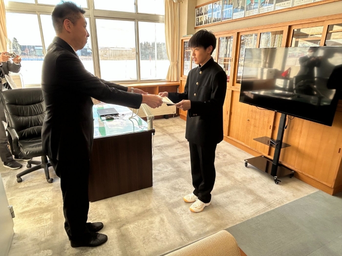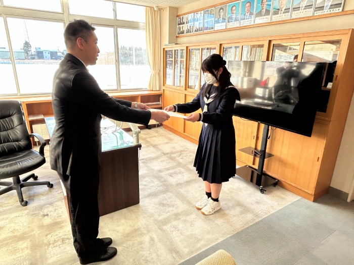 今日は北海道教育庁根室教育局より教育局長がご来校下さり、直々に賞状を授与していただきました。