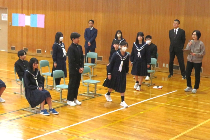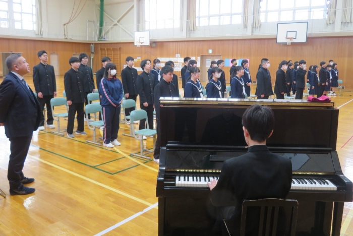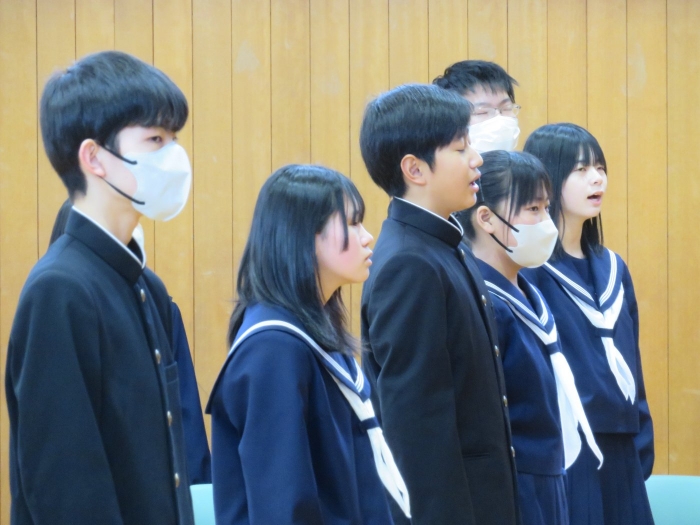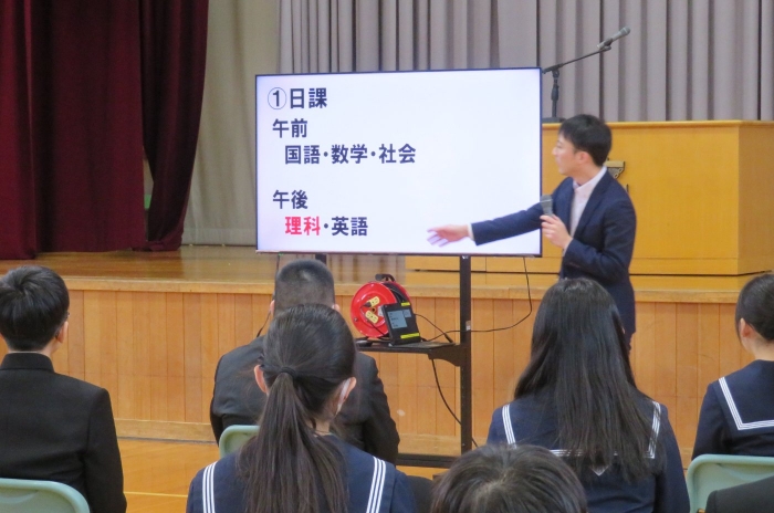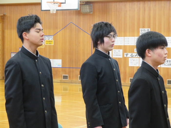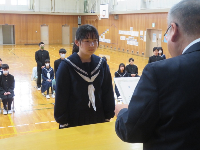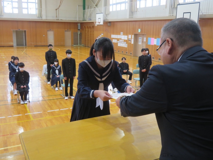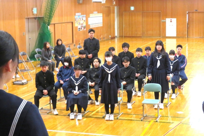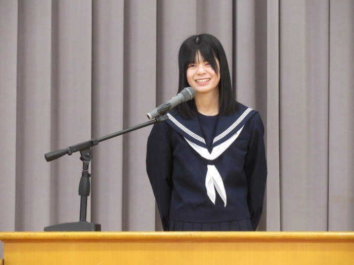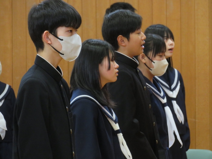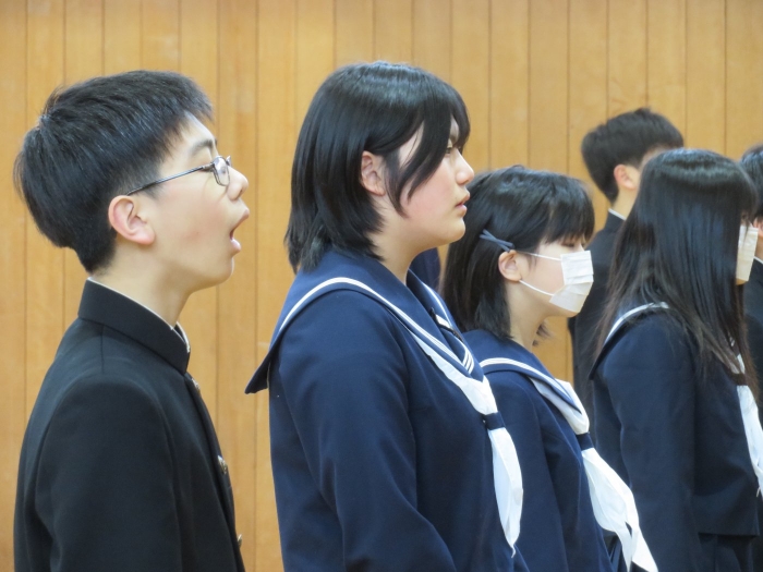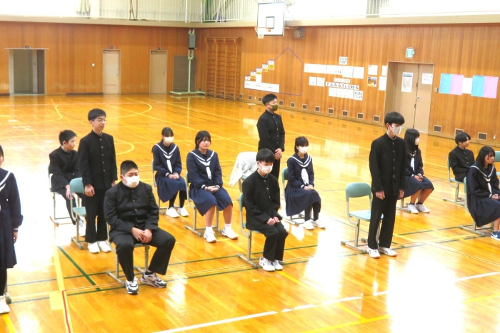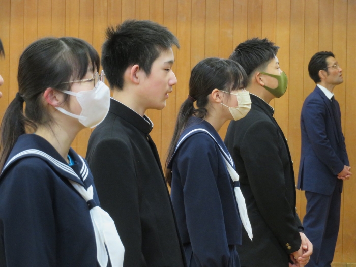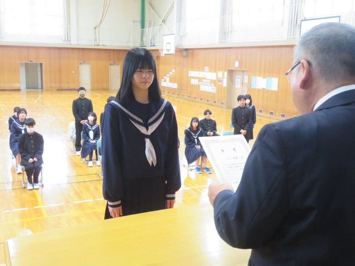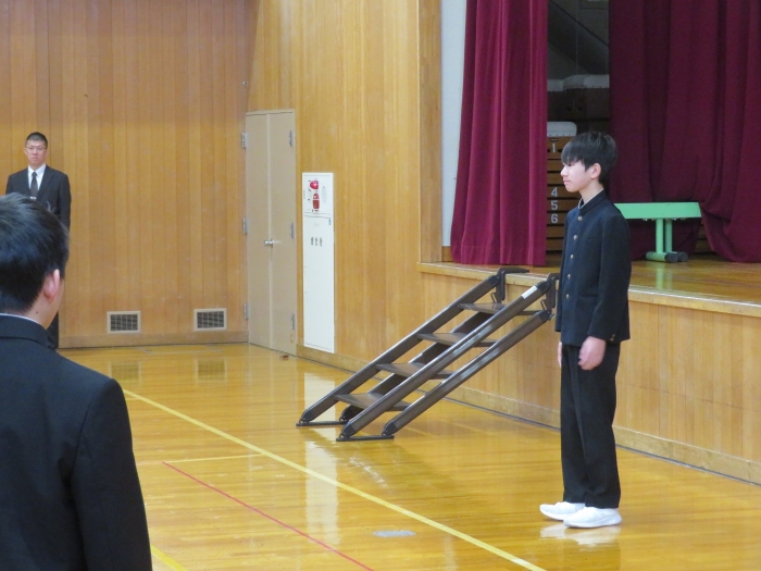 今日は全校集会Cがありました。2年生から1名がスピーチ発表をし、校内書初め展の表彰を行いました。また、教務の先生が2月5日(水)に実施する学力テストについて説明しました。