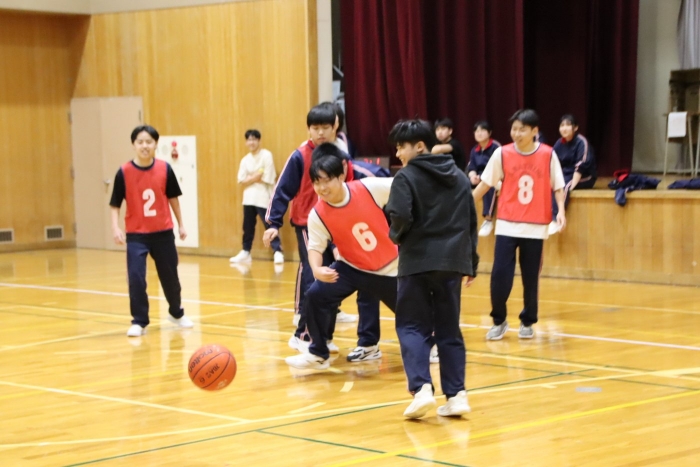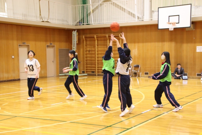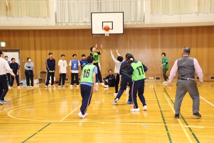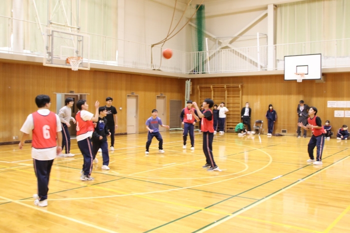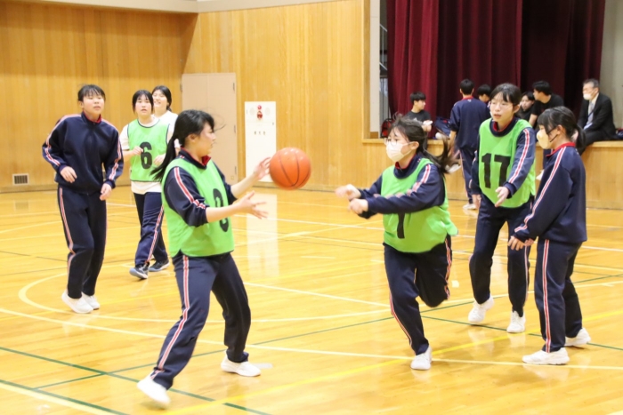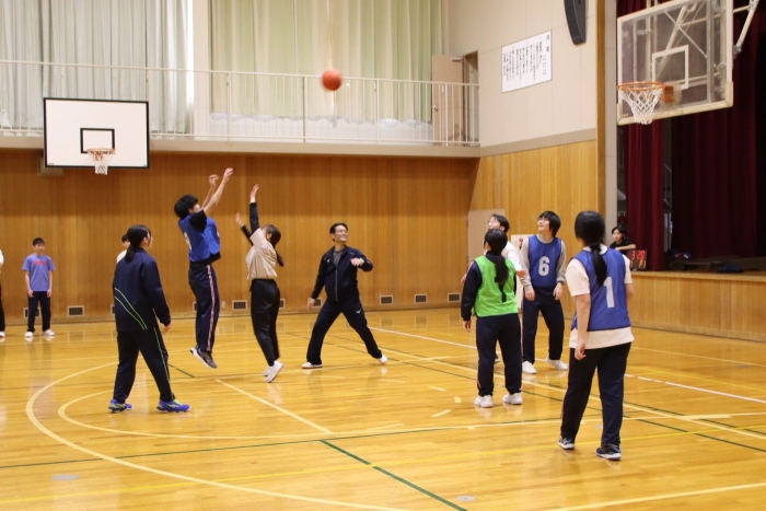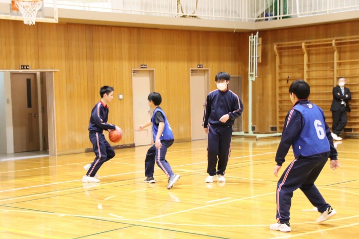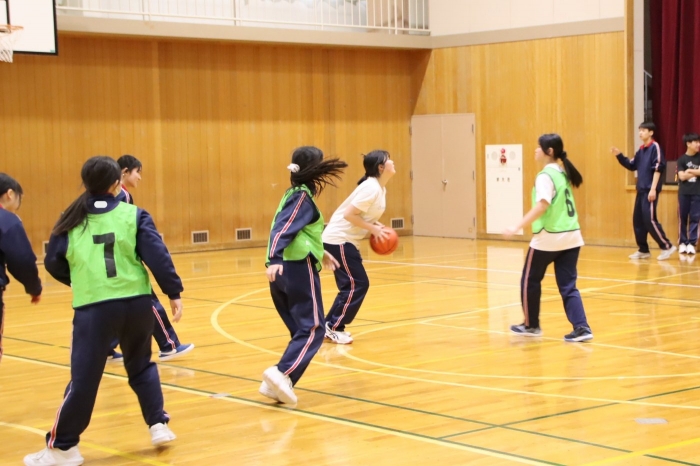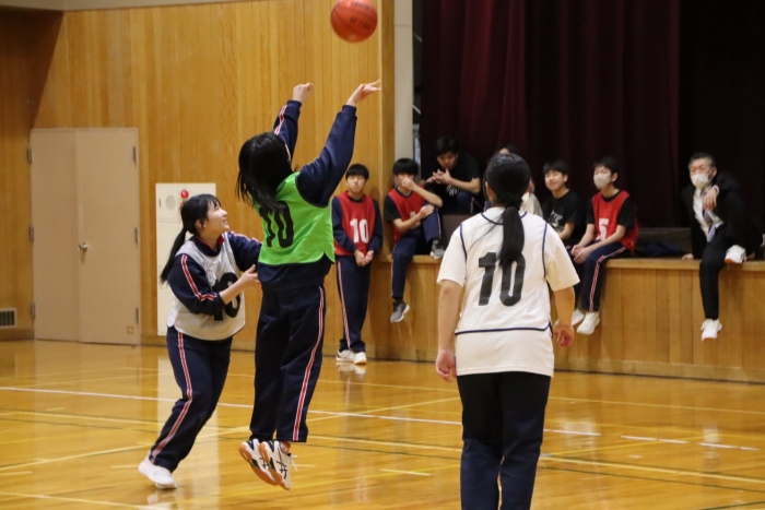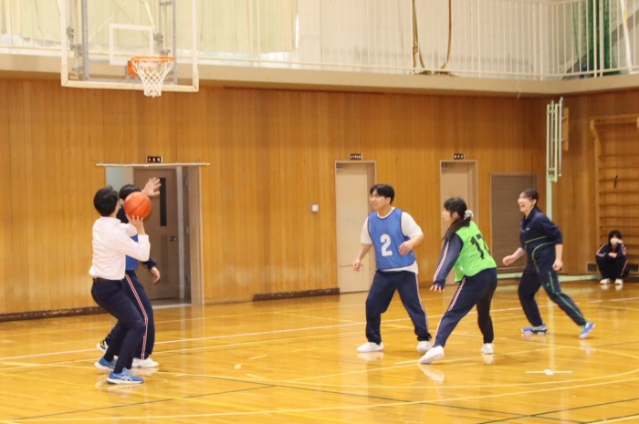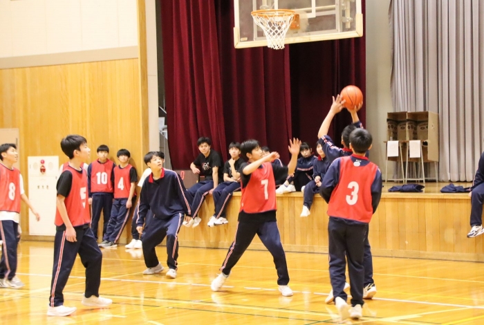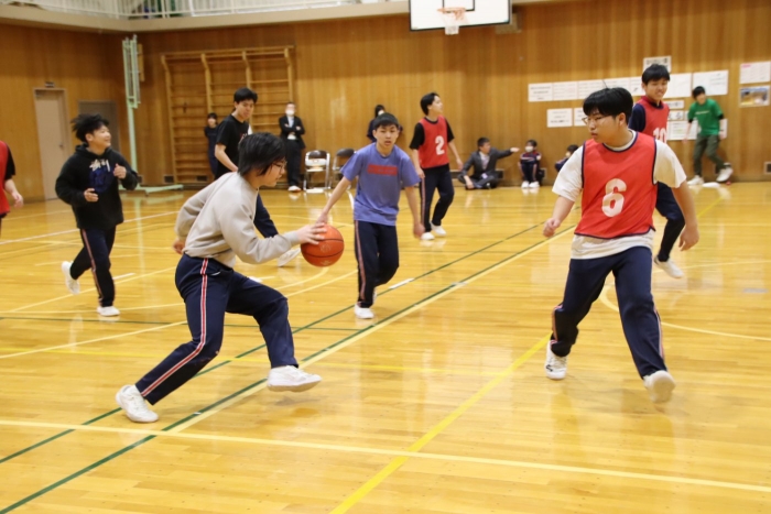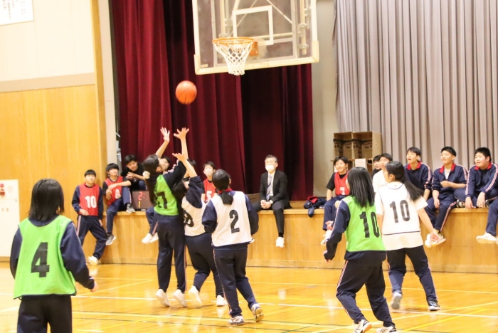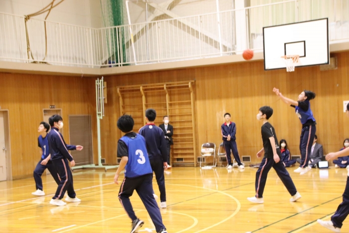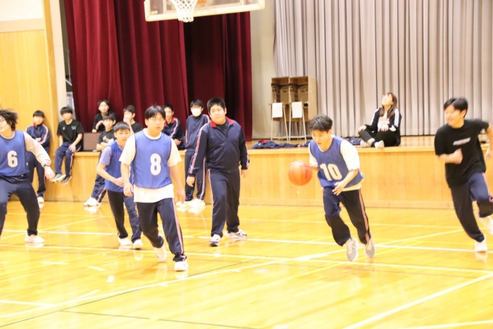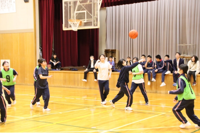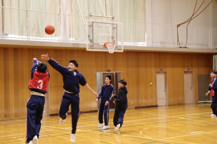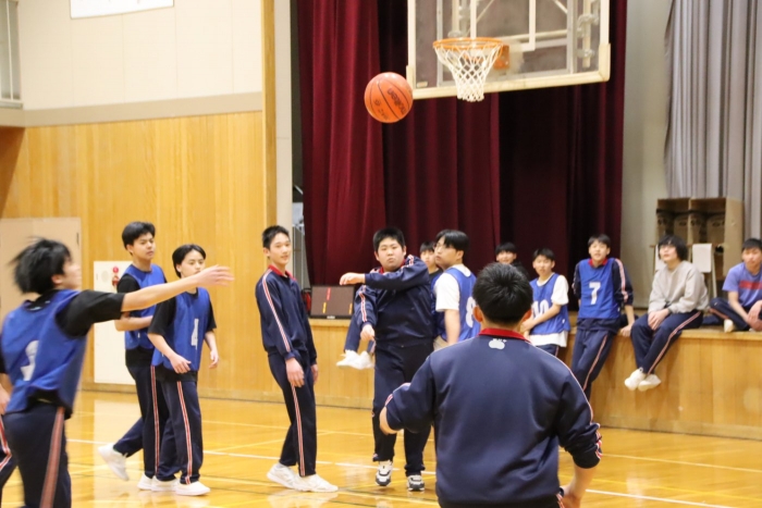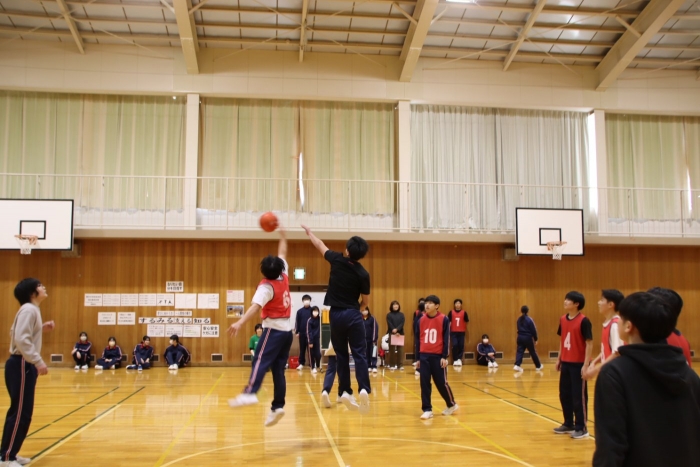 球技大会②(バスケットボール) 2025年03月10日(月) 日々のできごと #野付 #スポーツ ※3月7日(金)実施 後半はバスケットボールの試合をしました。 赤組 VS 青組 男子の対戦 感慨 赤組 VS 青組 女子の対戦 1・2年 VS 3年 男子の対戦 1・2年生 VS 3年生 女子の対戦 弟をお母さんとともに参観に来た卒業生も参戦! 3年生 VS 先生&卒業生 閉会式 総合成績は・・・何とドロー! 保体委員会を代表して終わりのあいさつ 両軍とも、チームメートにパスを公平に回し、積極的なシュートを狙う姿が印象的でした。面白いプレーや好プレーが続き、とても見応えがある球技大会でした。
