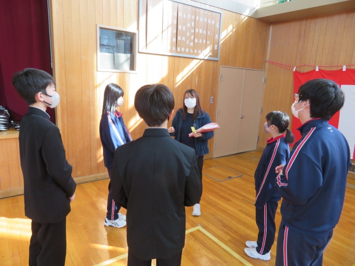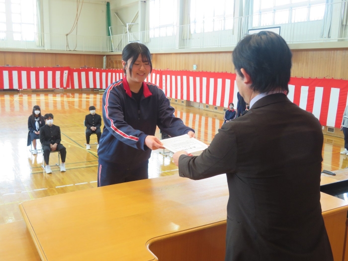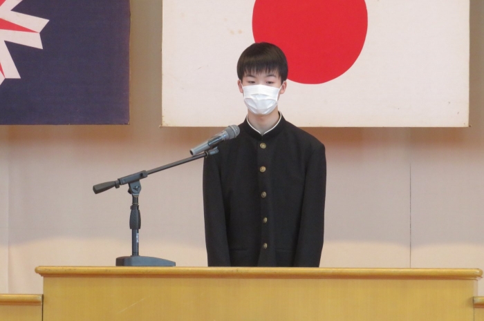 今日は全校朝会Bがありました。今日は2年生1名のスピーチと女子バレーボール部の表彰を行いました。
