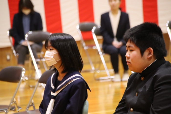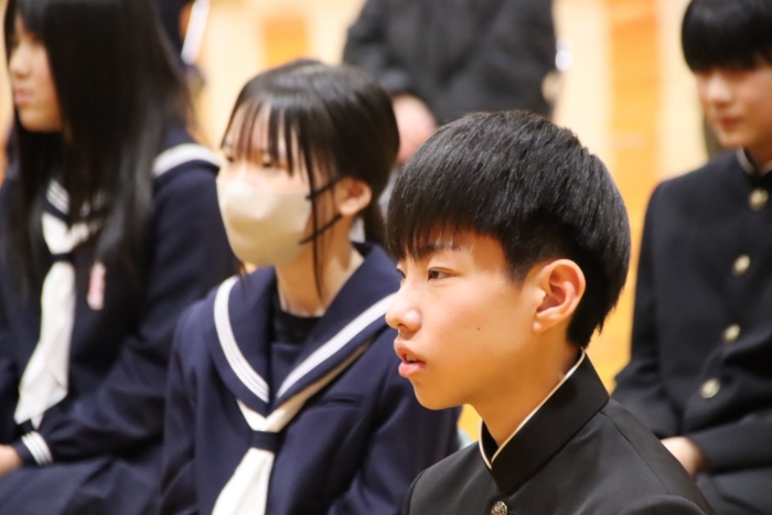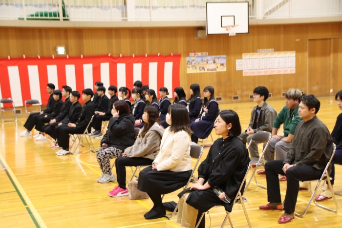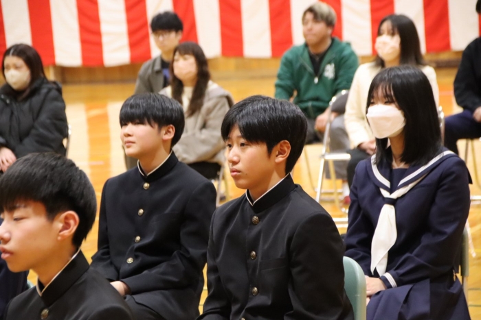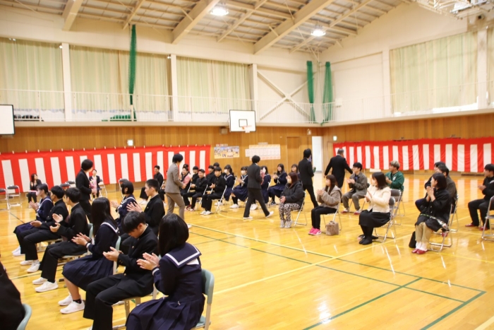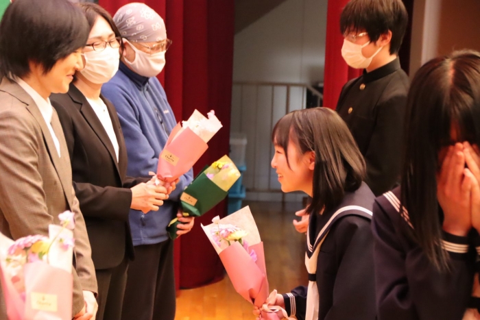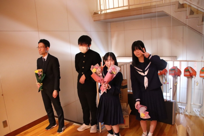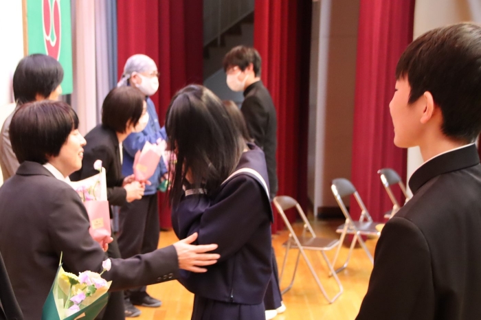 離任式 2025年03月25日(火) 日々のできごと #野付 ※3月24日(月)実施 2度目の卒業式の終了後、離任式を行いました。今年度をもって異動する先生が4名、退職する先生が1名です。 3年生と保護者の方々、かつての教え子の方々も出席してくれました 話す人の顔を見てしっかり話を聞く野中生 生徒代表あいさつ 花を渡す前の舞台裏 これまでの思い出があふれます 離任する先生方が退場します 式が終わっても、教職員や生徒、保護者、地域の方々から温かい言葉が贈られ、感謝の気持ちが溢れるひとときとなりました。みなさんとの思い出は宝物です。野付中での経験は一生の財産であり、これからも応援し続けます。これまでありがとうございました。