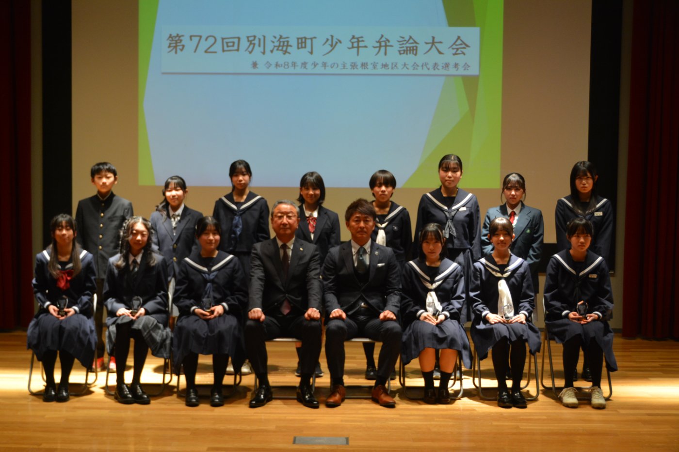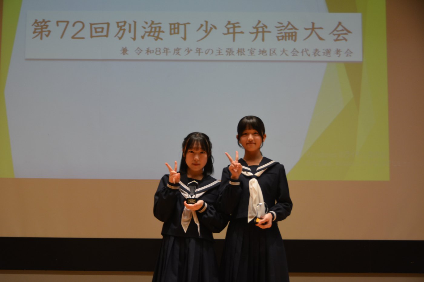【野付中】別海町弁論大会 W受賞おめでとう 2025年11月17日(月) NEW 日々のできごと 11月15日(土)に別海町弁論大会が開催されました。本校からは2名の弁士が挑戦し、2人とも優秀賞をいただきました。おめでとうございます。 学級弁論大会そして校内弁論大会を経て、仲間や先生方と磨きをかけ、自分が納得いくまで練習し、自信をもって本大会に臨んだことが結果につながりましたね。