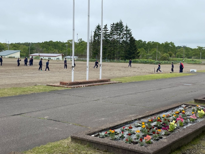 体育の授業? 2022年06月03日(金) 日々のできごと この1コマだけ見ると、体育の授業のように見えますが・・・実は昼休みの様子です。体育教師と一緒に1年生から3年生まで仲良く「ティーボール」で遊んでいます。野付中の生徒は運動能力も高く、このように日頃から体を動かしているからかもしれませんね。