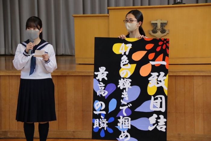 最後に生徒会書記局が体育祭のテーマを発表しました。みんなで一致団結し、それぞれの持ち味を生かして最高の体育祭としましょう。