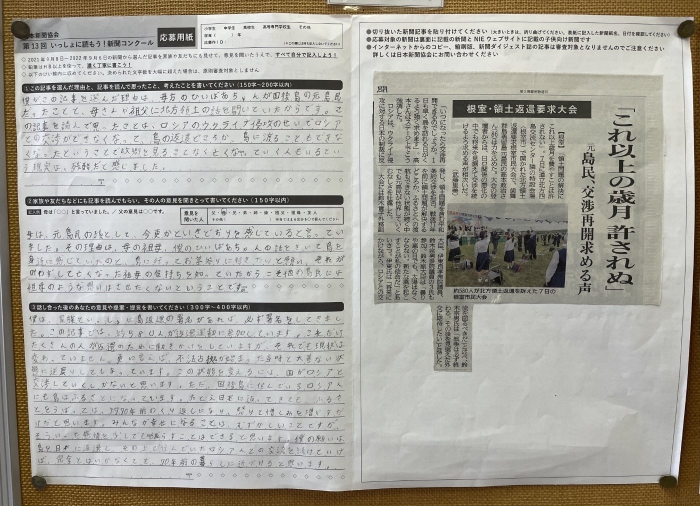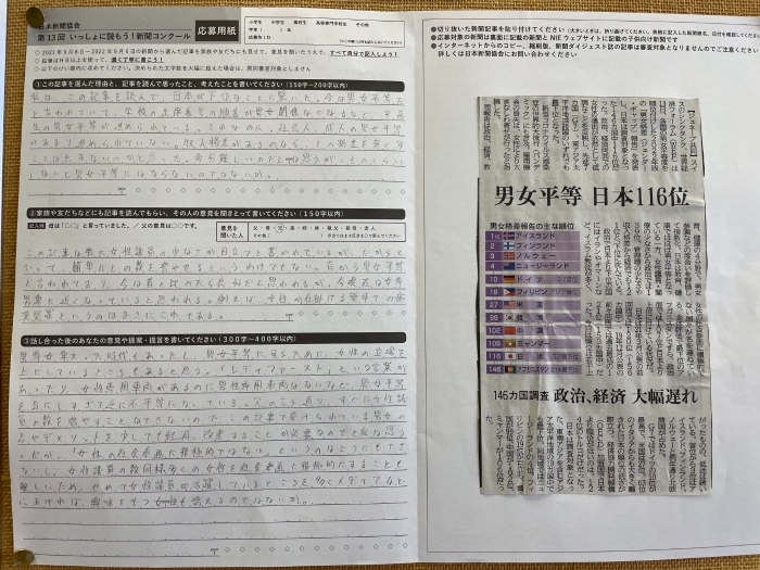 NIEの取組の一環として、夏休みの課題で「いっしょに読もう!新聞コンクール」に取組みました。気になった新聞記事について、①「選んだ理由と記事を読んだ自分の感想や意見」②「家族に自分が選んだ記事を読んでもらい、交流した内容」③「意見交流した後の自分の意見・感想・提案・提言」を既定の用紙に記入しました。とても大変な課題ですが、全員が粘り強く取り組み、頑張って完成させました!