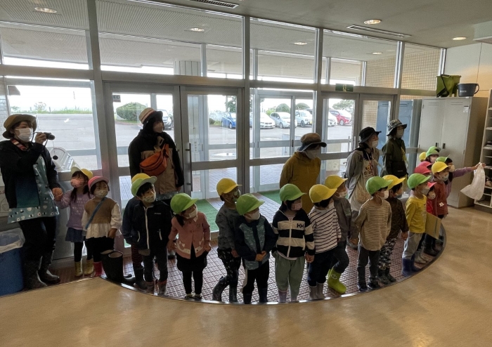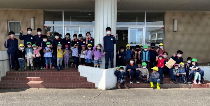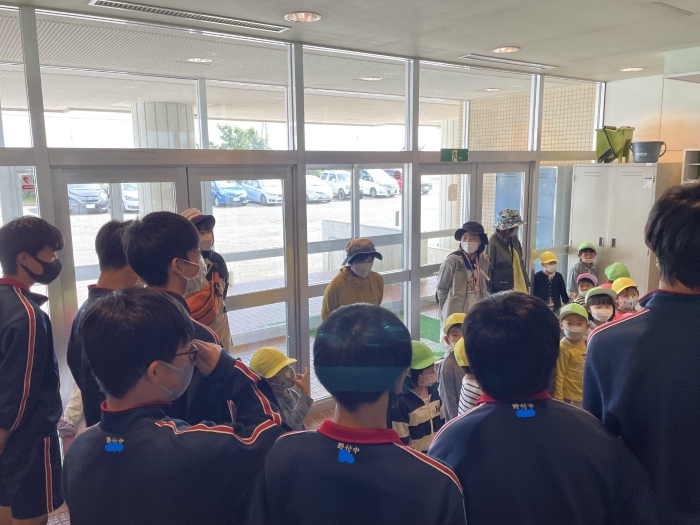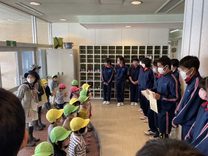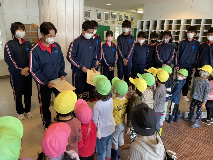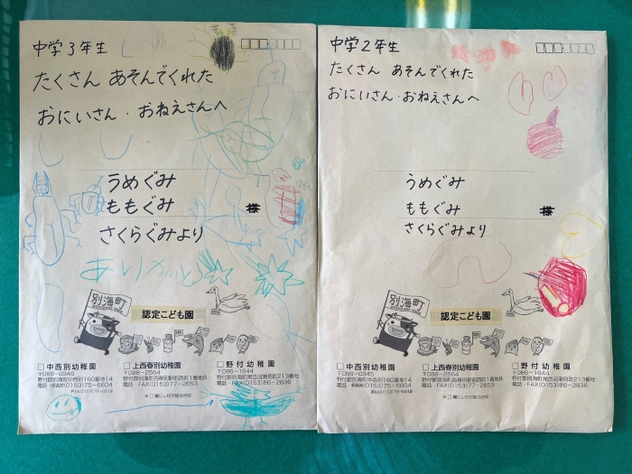 野付幼稚園児が来てくれました! 2022年09月21日(水) 日々のできごと 10分の休み時間をめがけて、野付幼稚園の子どもたちが中学校に来てくれました。先日中学生が職場体験と保育実習で訪問させていただいたのですが、「遊んでくれたお礼」ということで、手紙を書いて手渡しにきてくれました! 「こんにちは~!」と元気な声が玄関ホールに響きます 手紙の入った封筒を受け取りました 優しい眼差しで園児たちを見ています やっぱり小さい子どもは可愛い! 中身をお見せできないのが残念です… 最後は記念撮影! 明日は職業体験学習の発表会ですが、野付幼稚園の先生方にもご観覧いただけることになりました。今後もますます幼小中の交流を深めていけたら幸いです。