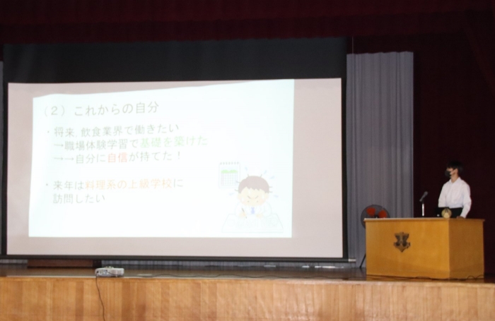 2年生が職業体験で学んだことをまとめ、その学習成果を発表しました。来年に向けて1年生が発表を聞き、職場でお世話になった方や保護者の方も観覧に来てくれました。