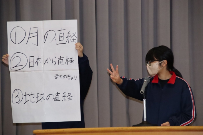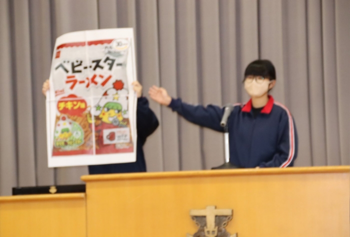 2年生のスピーチ「お菓子の雑学」について。「カモン!」と助っ人を呼び、画像や質問を提示しながら工夫のある発表でした。1日に生産されるベビースターの麺をつなげた距離は・・・?