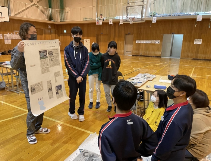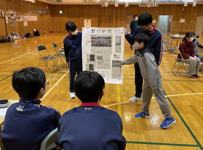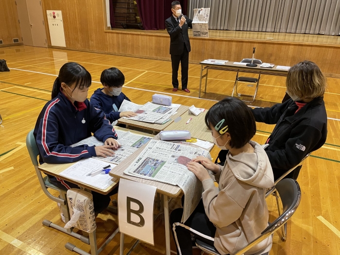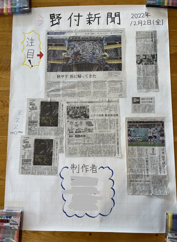 本日は、野付学校区CS、学びの土台づくり部会主催による小中合同「まわしよみ新聞」を実施しました。北海道新聞社みらい教育推進室よりK様を講師としてお招きし、CSのメンバーの方々と小学生とともに、気になった新聞記事について紹介しあい、それらの記事をまとめ、最後に壁新聞をつくりました。