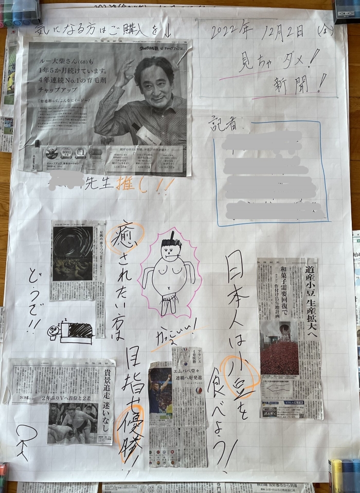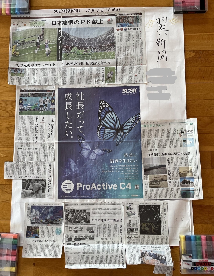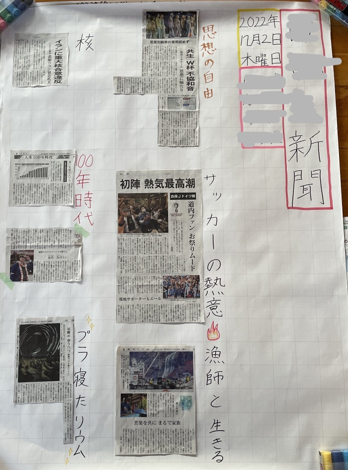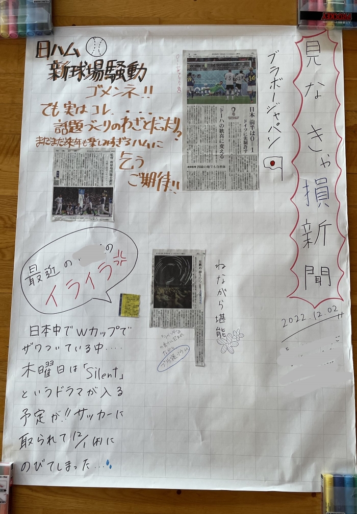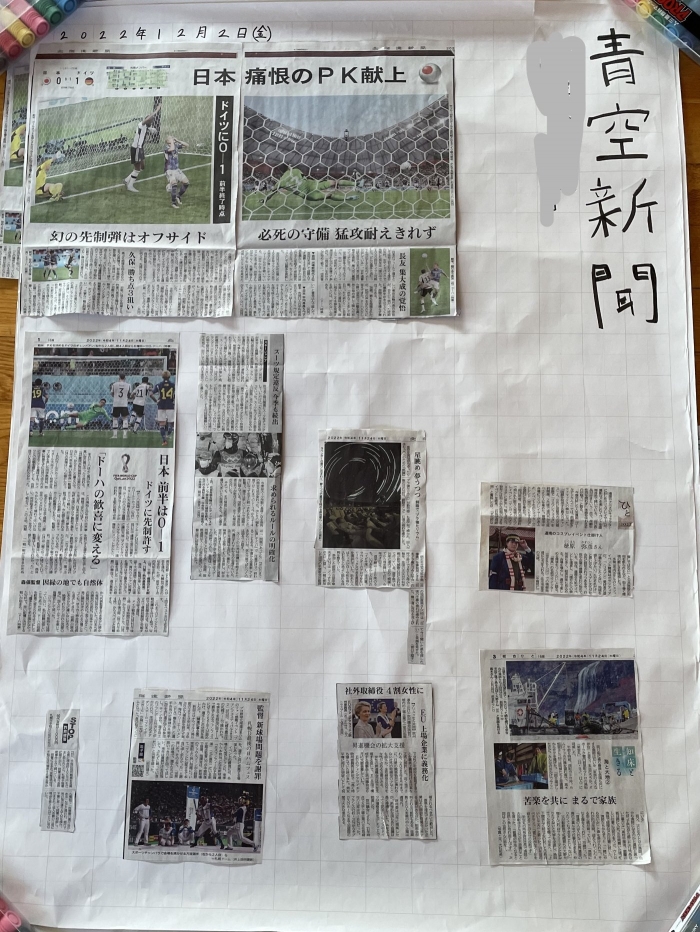 以降、本日作成した壁新聞です。時間も限られており、満足いく新聞を完成させられなかったグループもありましたが、「もっと時間があれば・・・」と大変悔しがっていました。それだけ真剣に取り組んだ証拠です。