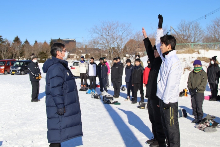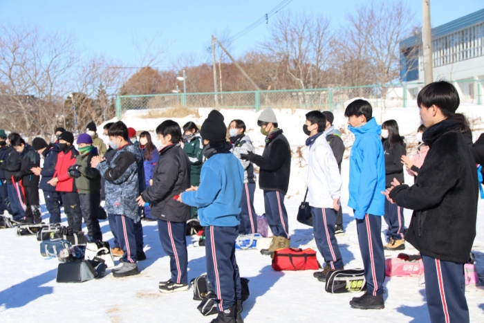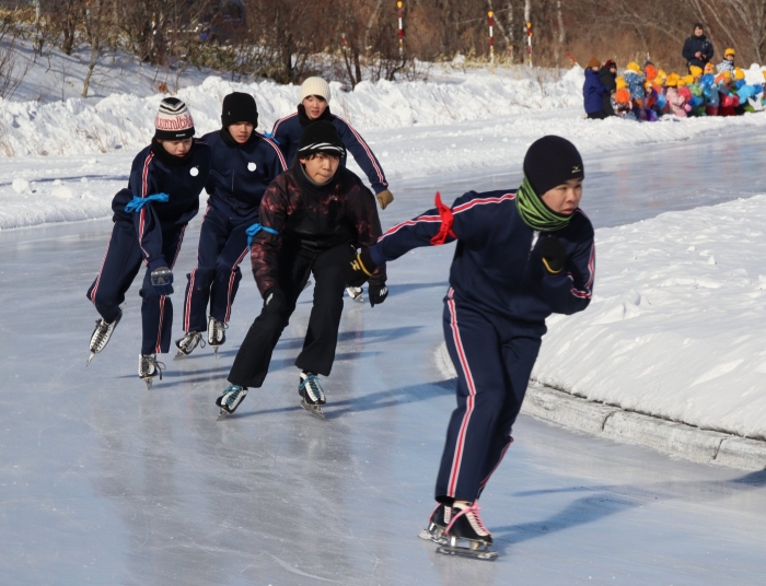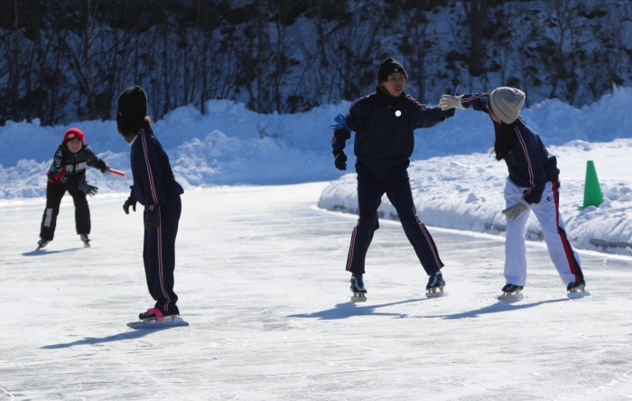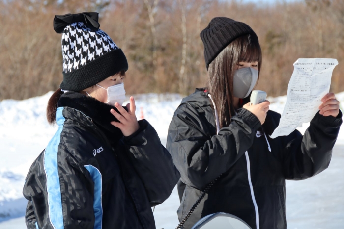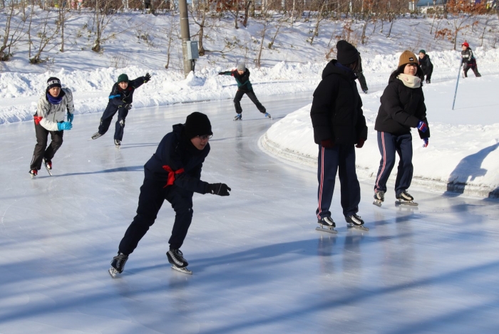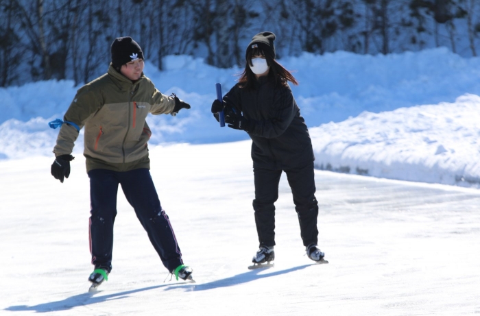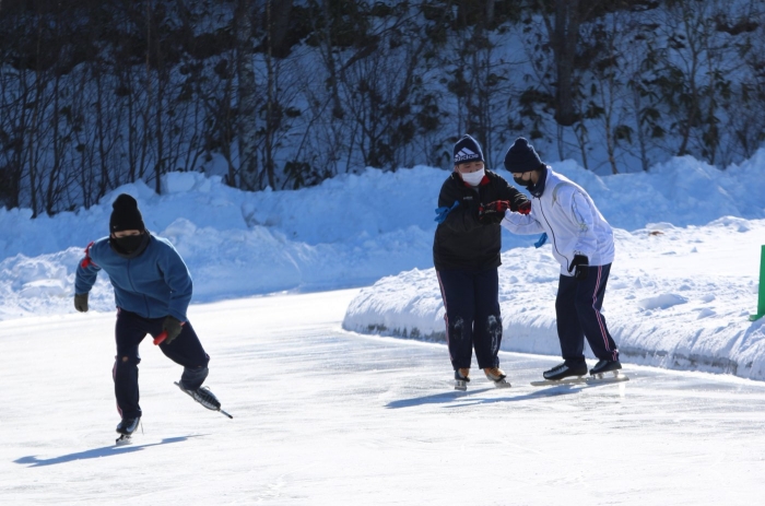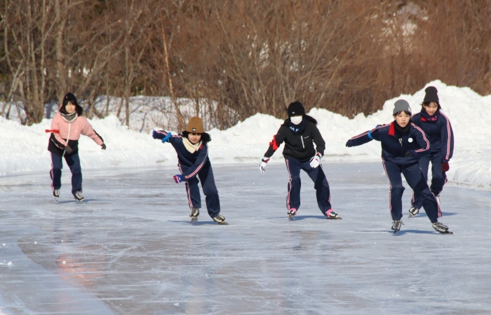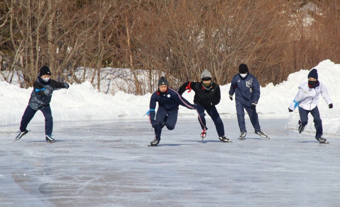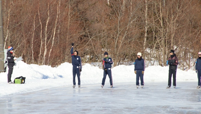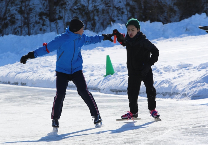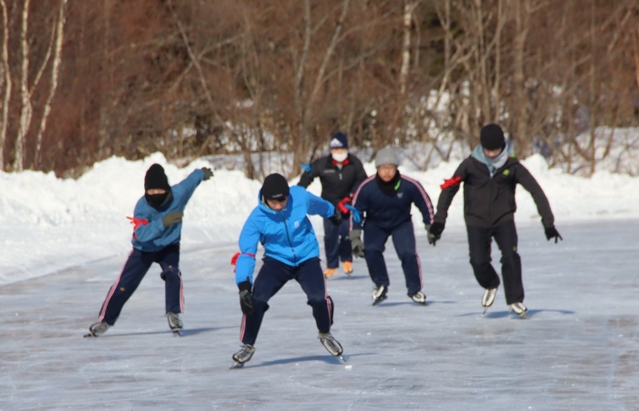 散水車の故障により水撒き作業ができず、リンクの氷は薄く割れやすい状態で、開催すら危ぶまれたスケート記録会でしたが、スケートリンク造成メンバーの方々のお陰で、何とか本日、実施することができました。本来は午後からの実施予定でしたが、リンクの状態を考え、急遽午前の開催としました。