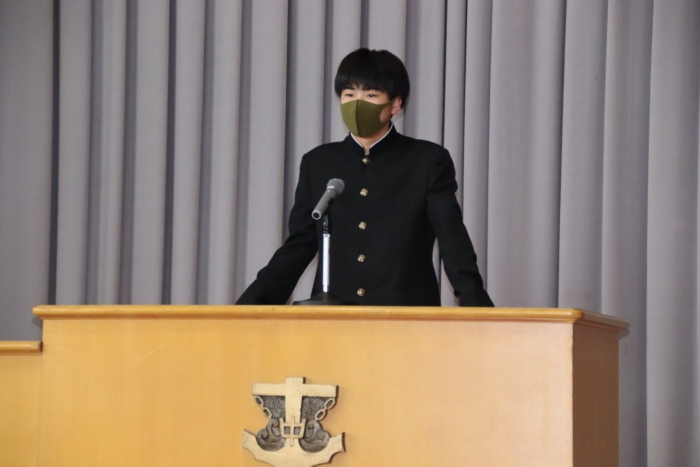 2年生のスピーチ「アメリカのバレンタイン文化」について。アメリカでは男子が女子にチョコレートをあげるそうです。『SDGsの観点から、ジェンダー平等な社会について考えると、とてもいい文化だと思う』と発表態度も素晴らしく、結びを上手にまとめたスピーチでした。