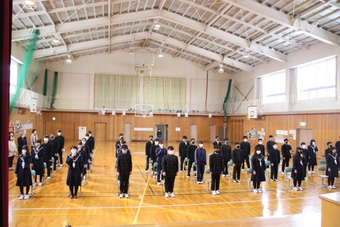 朝の寒さもやわらぎ、体育館が温まるのも早くなりました。今日は3年生にとって最後の全校朝会でした。