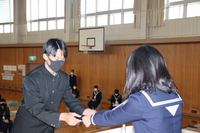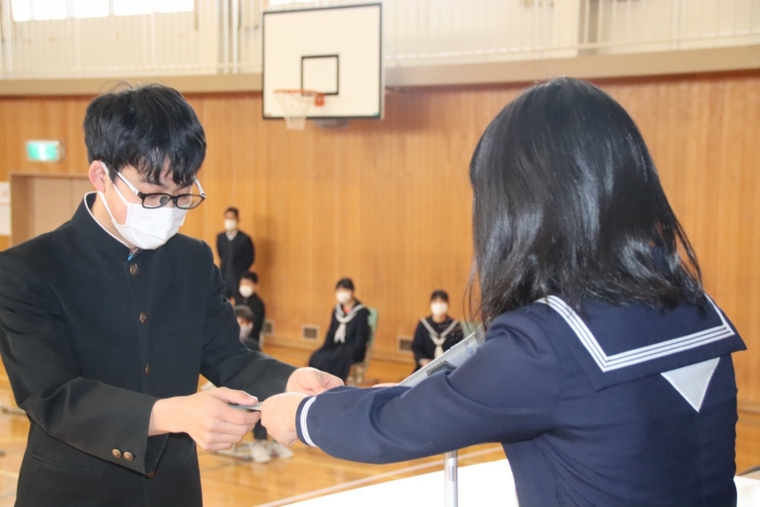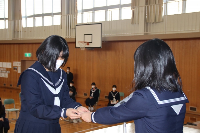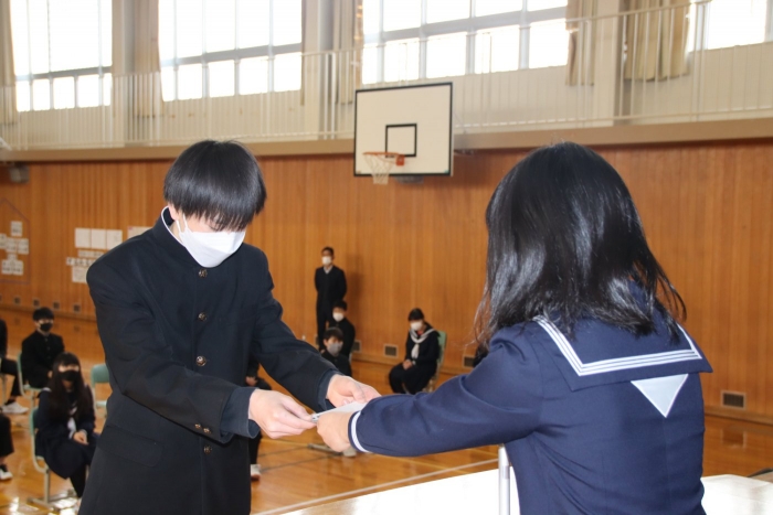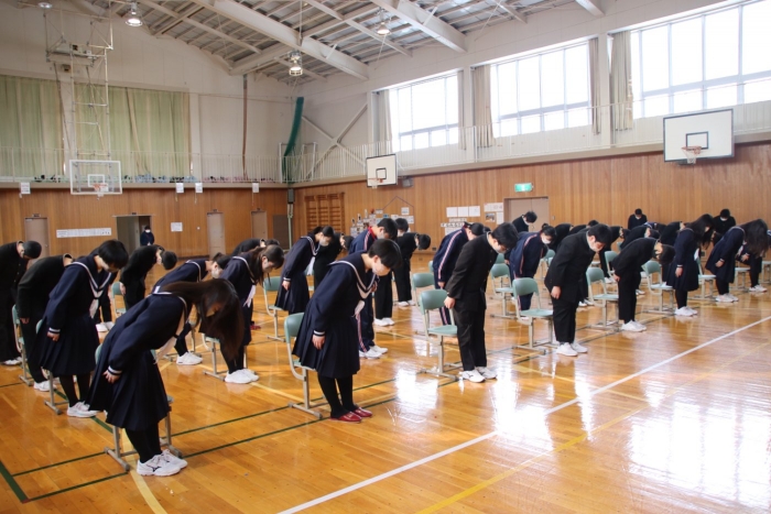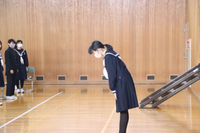 本校は月3回の全校朝会があり、生徒会については、準備が大変だったことと思います。しかし、この朝会の取組は、間違いなく本校生徒の表現力の向上と共感的人間関係の深化へと繋がり、安心・安全な学校生活づくりへの一助となっています。生徒会の皆さん、1年間本当にお疲れさまでした!