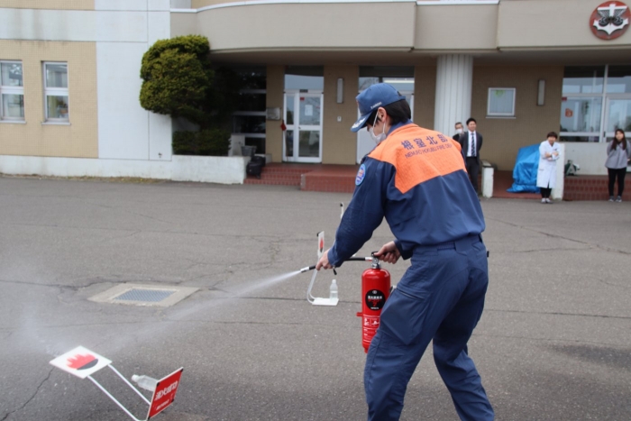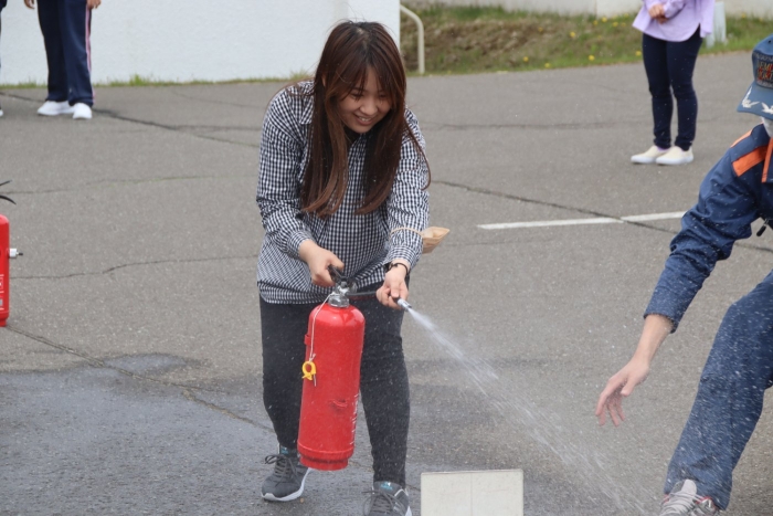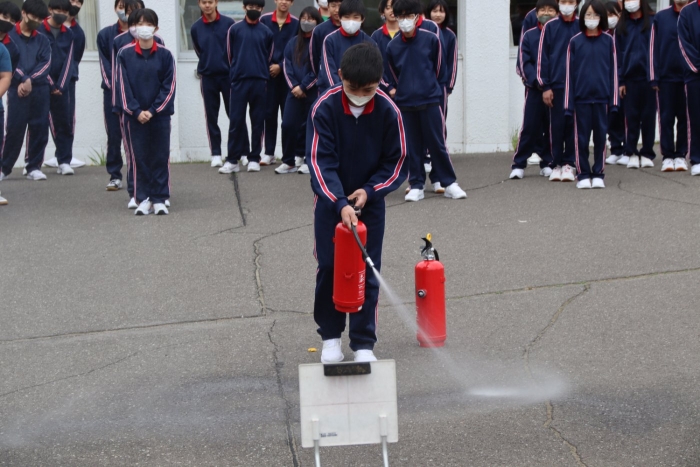 避難訓練(火災) 2023年05月19日(金) 日々のできごと 本日は火災を想定した避難訓練を実施しました。今回はどの学級も普通教室ではなく、体育館・理科室・家庭科室からの避難となり、歩く距離も長くなりましたが、短時間で外に出ることができました。 消火器の使い方について学びます 先生方もチャレンジ! 自宅地域の消防団に所属している先生はやる気満々でした 災害はいつ起こるか分かりません。どんなときでも適切な避難経路と避難方法を自己選択し、落ち着いて行動することが大切です。全員が真剣な態度で訓練に取り組み、教室での振り返りも頑張っていました。