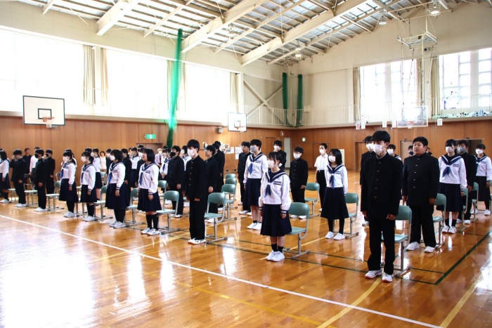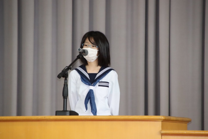 今日は全校朝会Cがありました。各学年から1名ずつスピーチ発表、生徒指導部の先生からのお話、根室地区中体連大会の表彰、生徒会書記局によるSmile Roadの表彰を行い、最後に保体員会からハンカチデーのお知らせがありました。