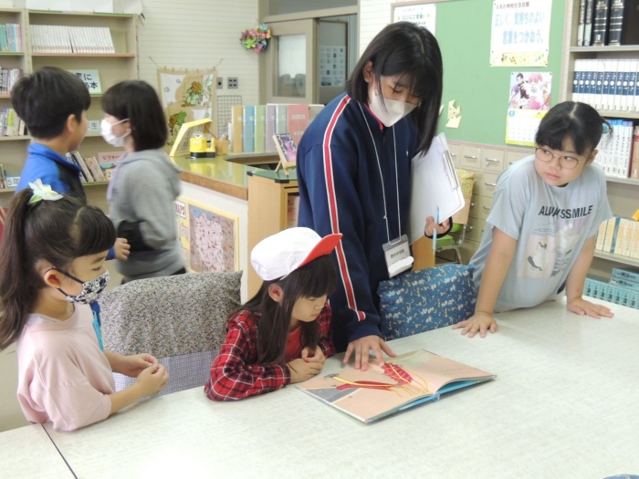 中休みの様子。絵本を読んであげています
