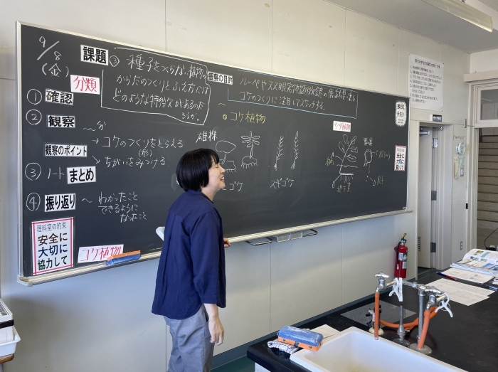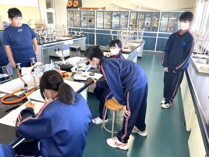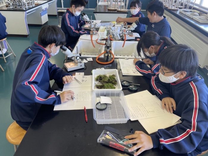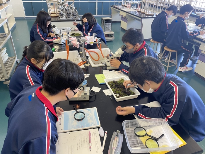 理科室では、1年生が顕微鏡を使ってコケ植物を観察し、コケ植物のつくりについて学びを進めていました。