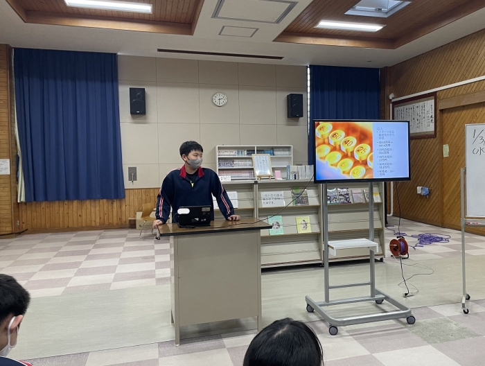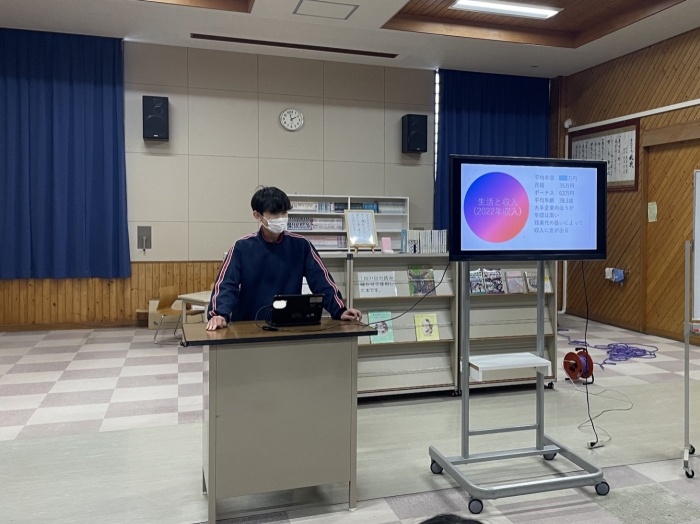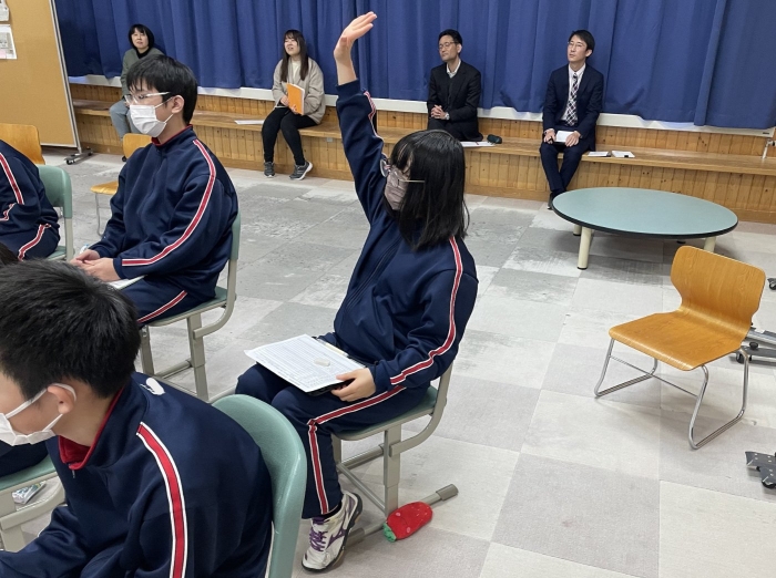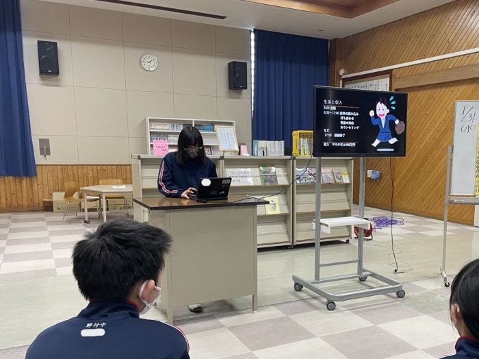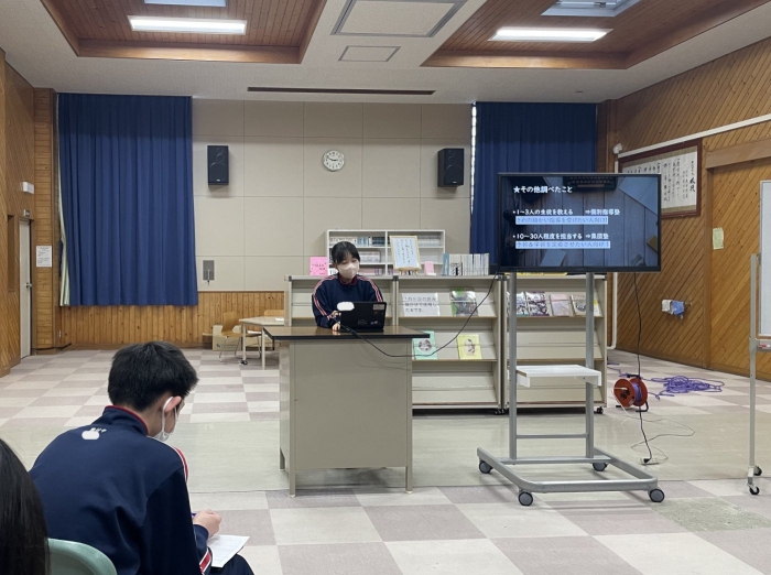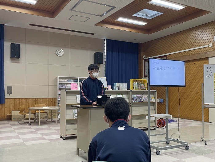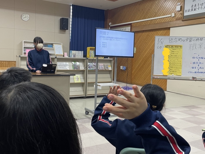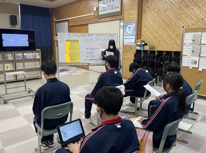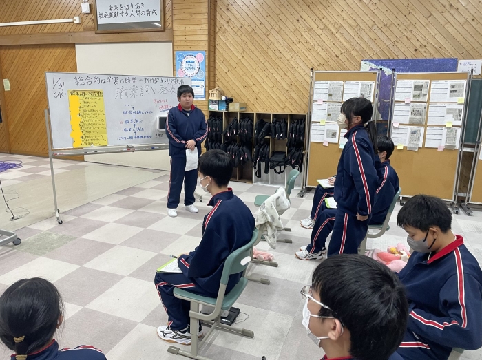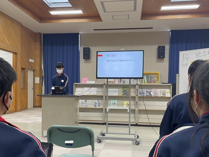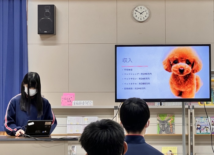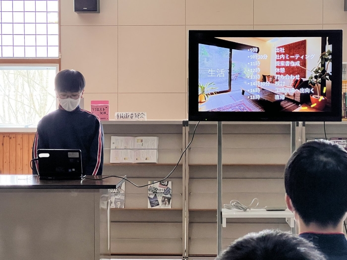1年生ながら、プレゼンにクイズを盛り込んで参加形式にしたり、スライド以外にも分かりやすい説明を補足したりするなど、発表方法にも工夫が見られました。また、その職業を選んだ理由や自分がもつ目標や夢について明確に述べることができており、とても感心しました。来年度の職業体験学習につながる素晴らしい発表会でした。