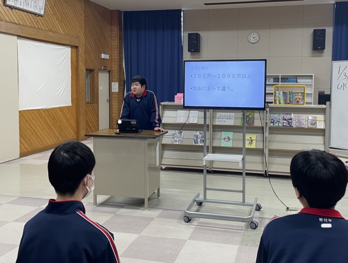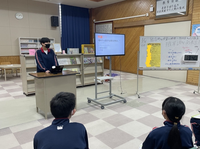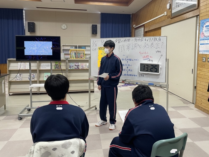 職業学習発表会を実施しました。進路適正判断の結果や興味関心から、自分が調べたい職業を決め、本やインターネットの情報を活用しながら、プレゼン資料を作成し、まとめた内容について1年生が発表しました。
