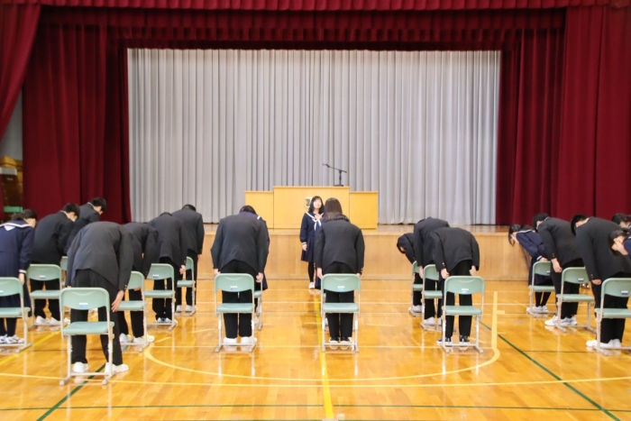体育館の冷え込みが激しく、非常に寒い中での朝会でしたが、子どもたちはそんな素振りは全く見せず、集中して臨んでいました。