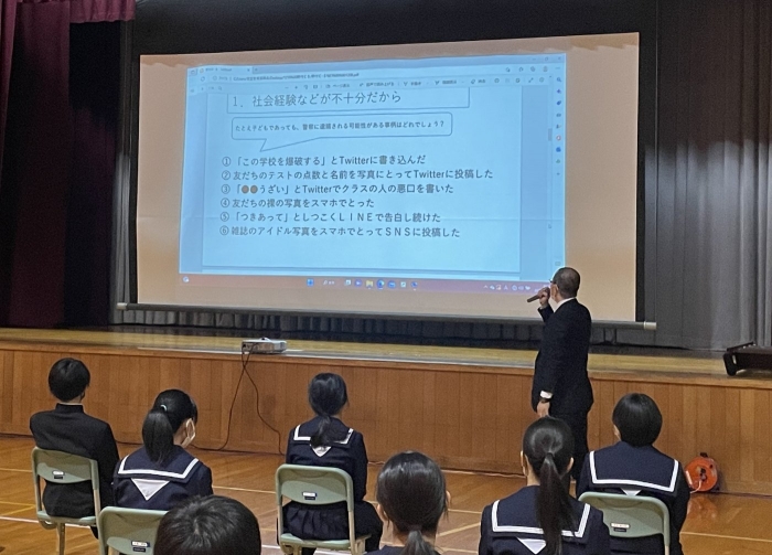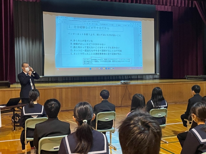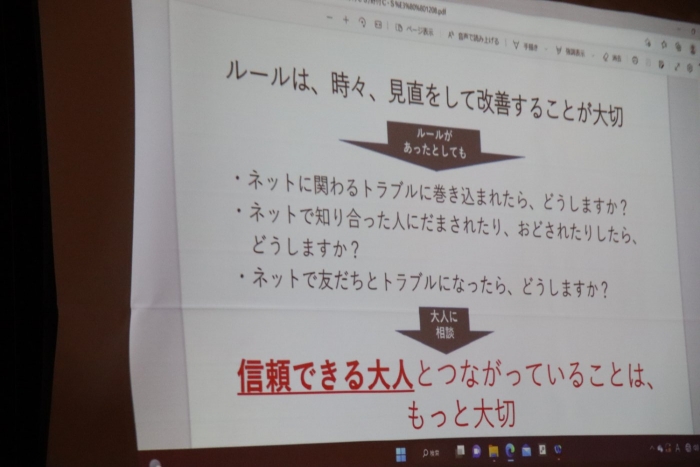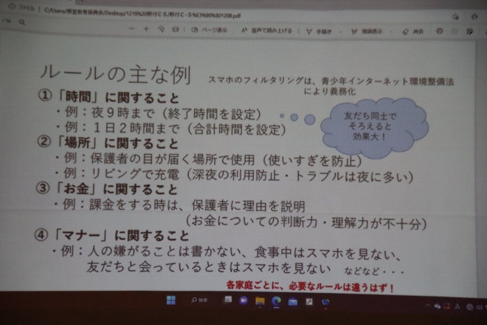 安間先生は最後にルールの主な例を提示してくださいました。スマホ使用のモラルやルールについて、分かっているようで分かっていないのが中学生です。大人がしっかりとルールを決め、それを守らせることがモラルにもつながっていきます。今一度ご家庭でもスマホ使用について話し合っていただければ幸いです。