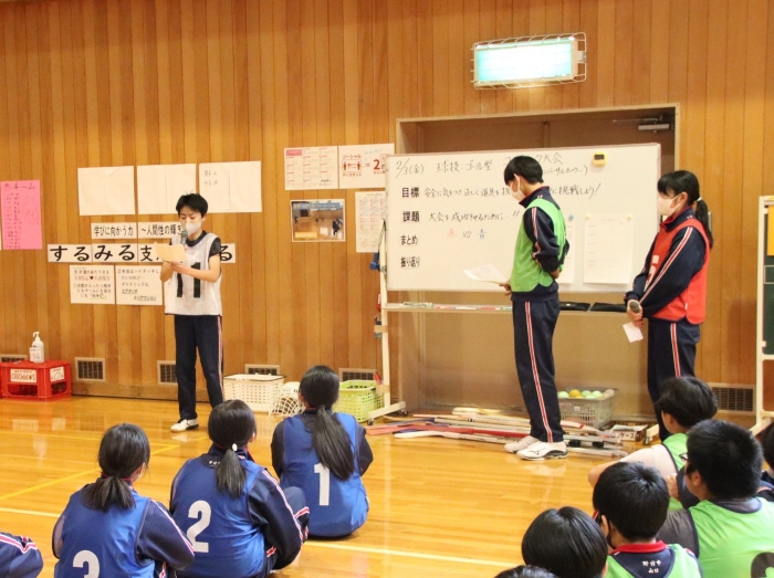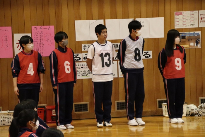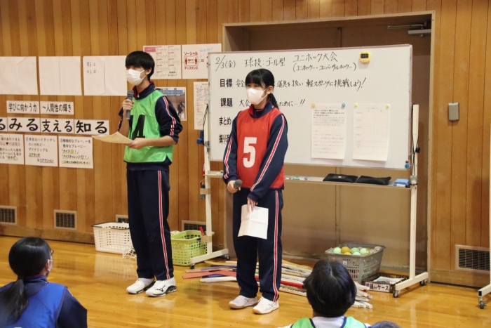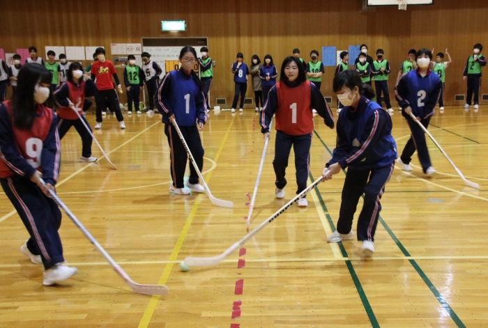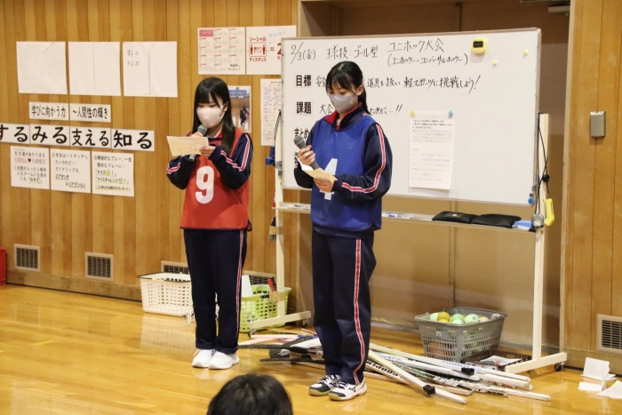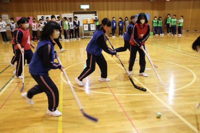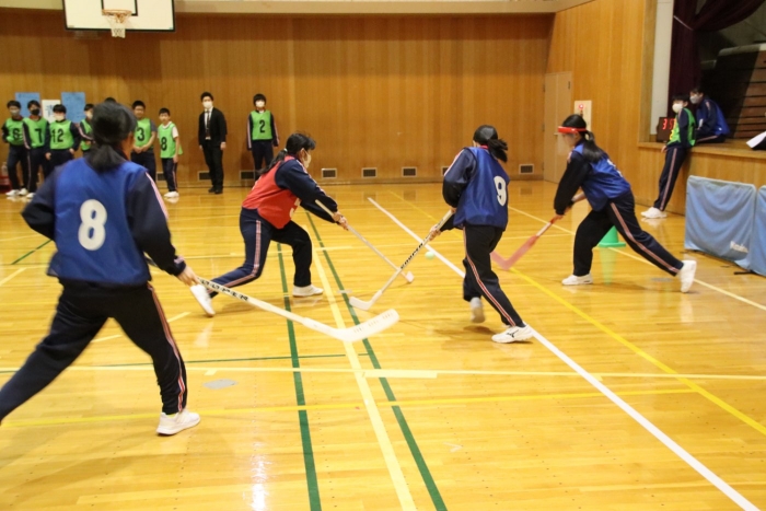 結果は赤組が勝利! ゲームに出た子どもたち全員が必死にスティックを使ってボールを追い、あきらめることなく全力でプレーしました。試合中はずっと大きな声援が飛び交い、珍プレーに笑いも起きながら、全校生徒一体となってユニバーサルホッケーを楽むことができました。3年生と一緒に取り組める行事も残り少なくなり、寂しさも感じますが、よい思い出づくりができた1日となりました。