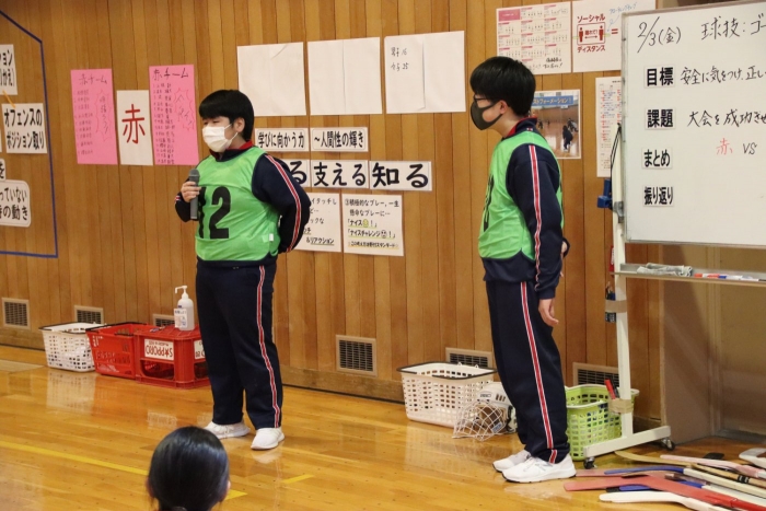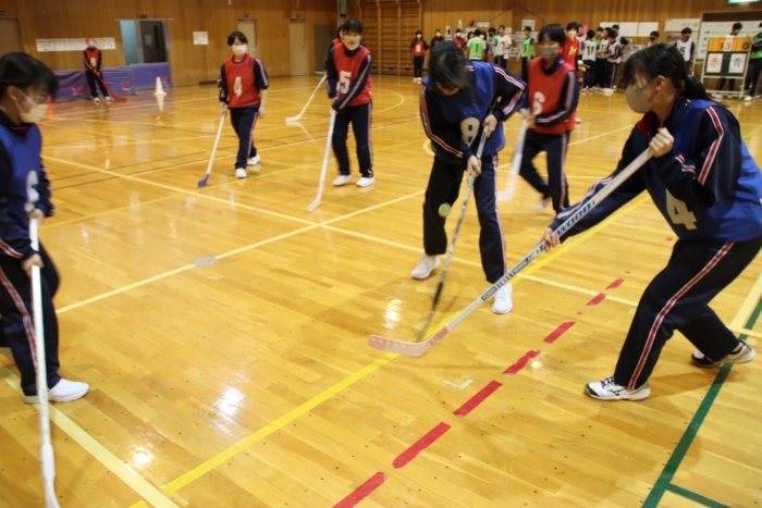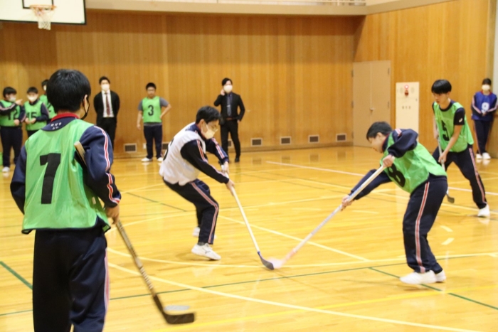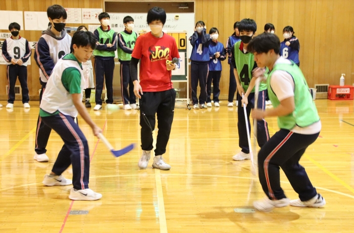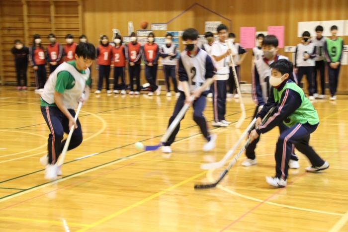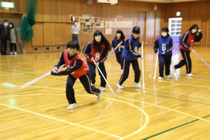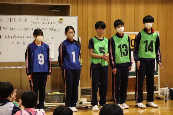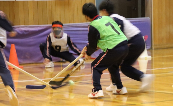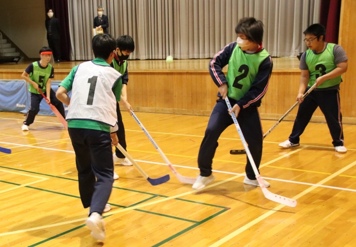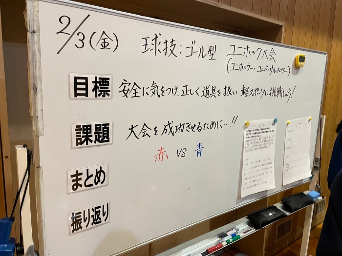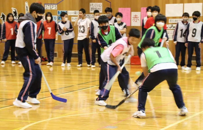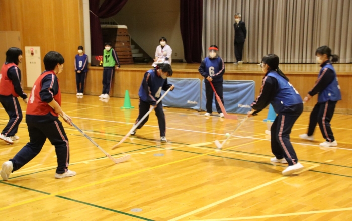 本日予定されていた長靴アイスホッケー大会は、リンクがクローズとなったため、体育館での「ユニバーサルホッケー」へと変更になりました。赤組と青組、室内での対決となりましたが、白熱した闘いとなり、全校生徒で大いに盛り上がりました。