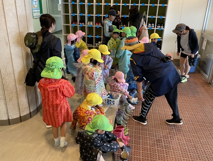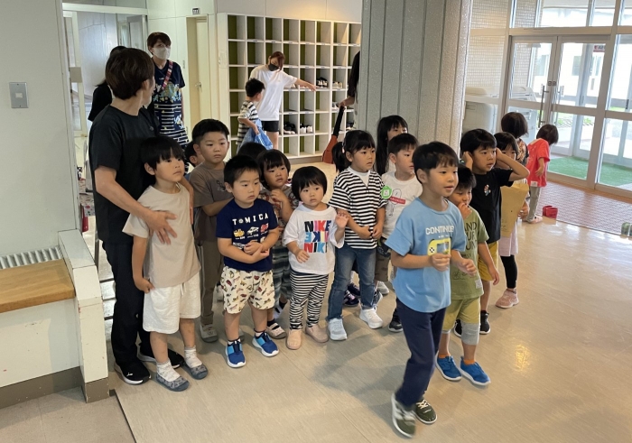 野付幼稚園の園児たちが、本校に遊びに来ました。9月には3年生が保育実習、2年生5名が職場体験で幼稚園にお世話になります。よって、園児たちと中学生の顔合わせを兼ねて、園児と一緒に遊び、交流する場を設定することにしました。