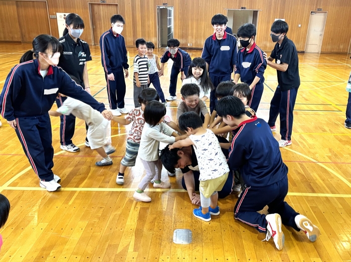 園児たちは、広い体育館で、元気いっぱいに時間を忘れるほど遊び、中学生も園児たちも汗だくになっていました。来月は中学生が幼稚園に訪問します。