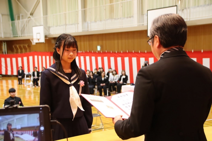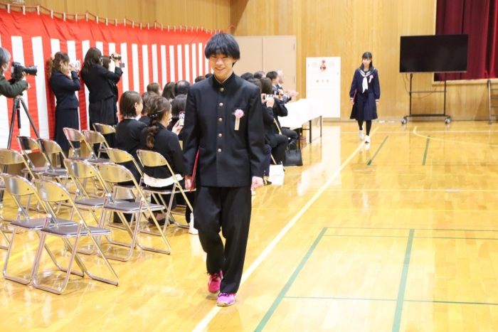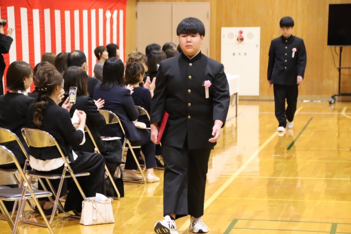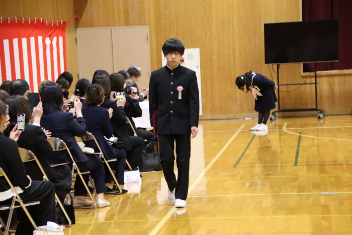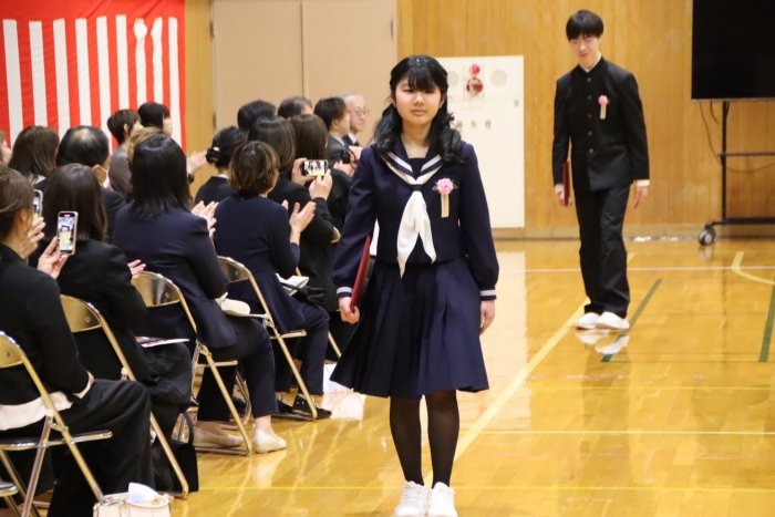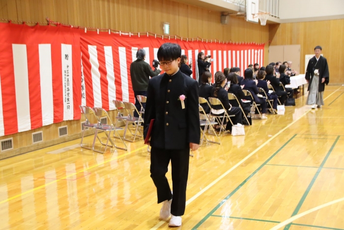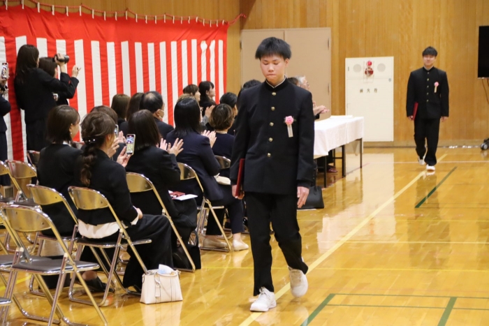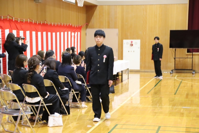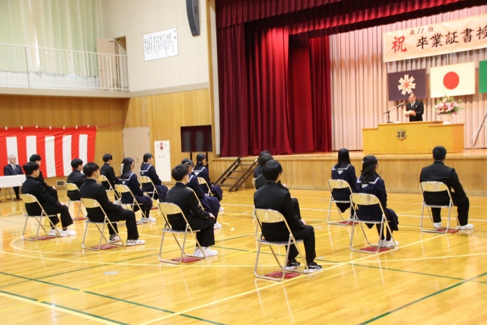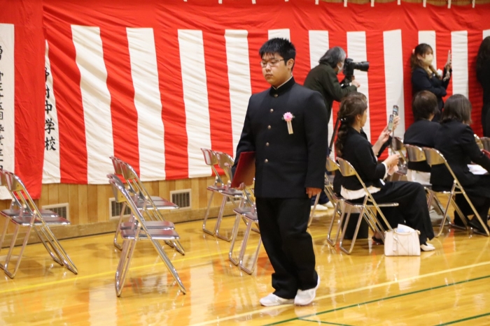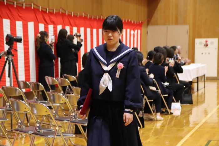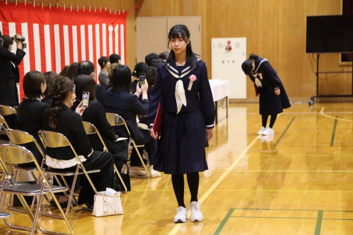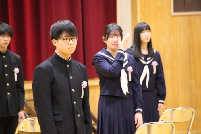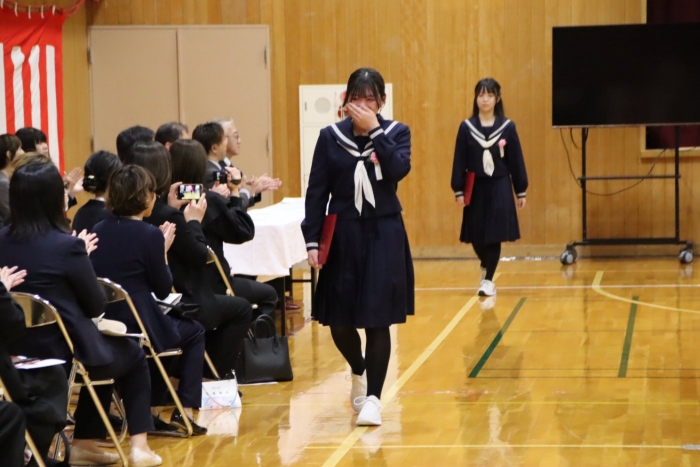 ①第77回卒業証書授与式 2024年03月12日(火) 行事 本日、第77回卒業証書授与式を挙行いたしました。今年度は16名の卒業生が野付中学校を立派に巣立っていきました。 卒業証書授与 校長式辞 卒業生それぞれに16の「ありがとう」 別海町教育委員会祝辞 3年生の数々の功績を称賛くださいました PTA会長式辞 「人は周りの人の助けがあって壁を乗り越えていく」 在校生送辞 3年生へ尊敬の念と感謝の気持ちを伝えます 在校生式歌「星影のエール」 在校生の歌声に涙する卒業生も 卒業生答辞 在校生、教職員、同級生に思いを伝えます。涙が溢れます 卒業生式歌「桜」 式歌「足跡」 卒業生退場 卒業生は教室に戻り、最後の学活です。②へ続きます・・・