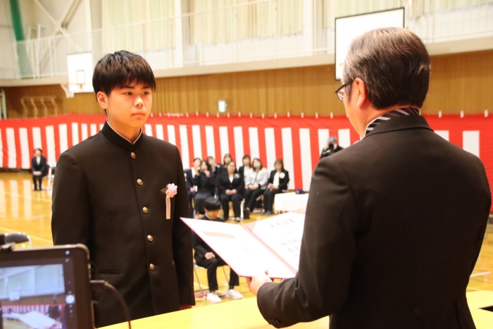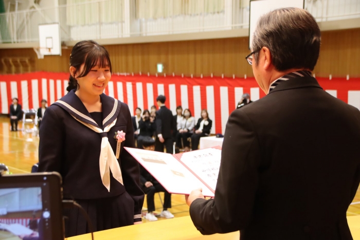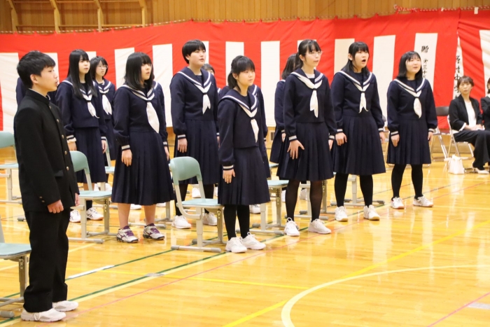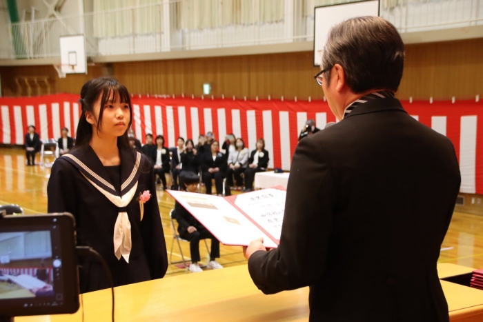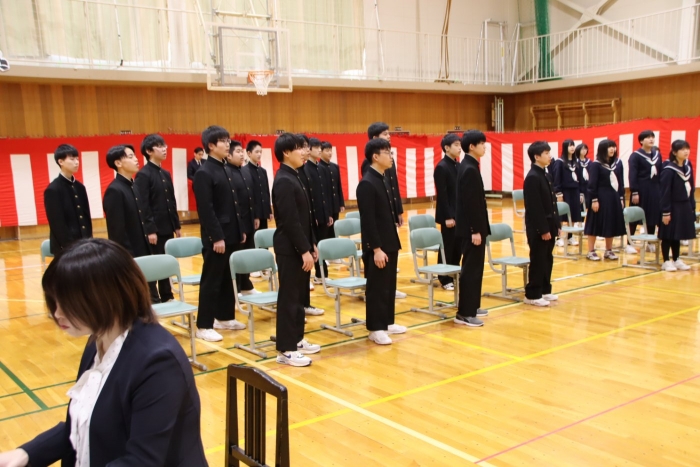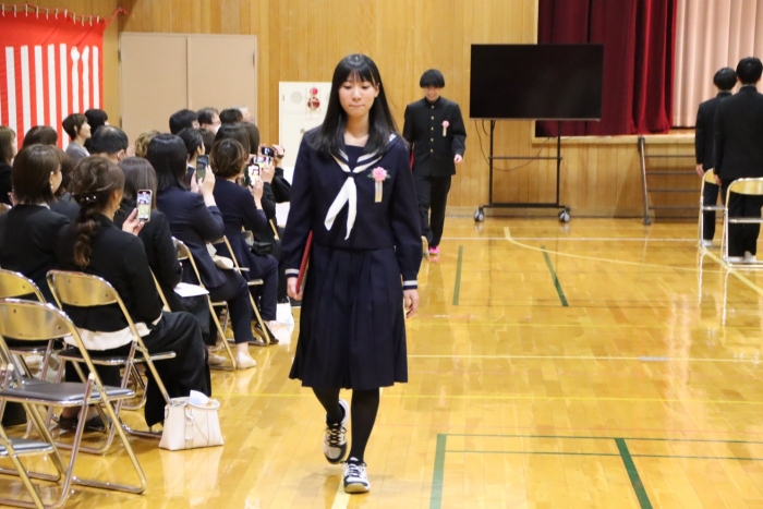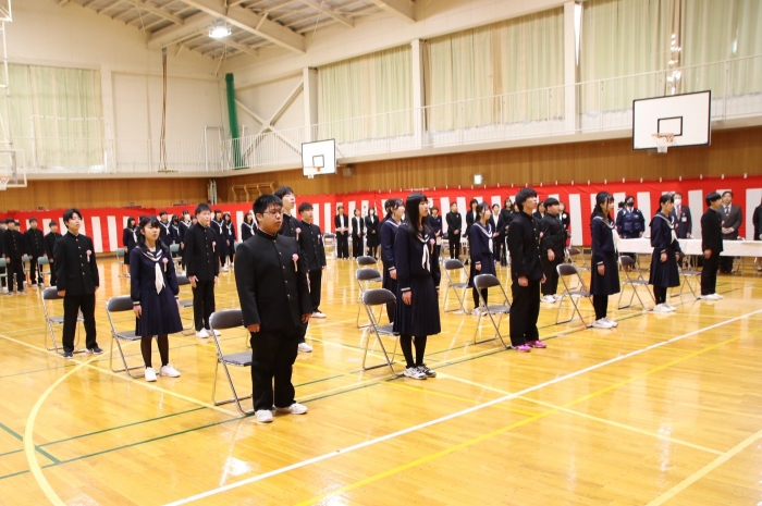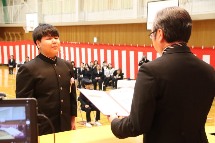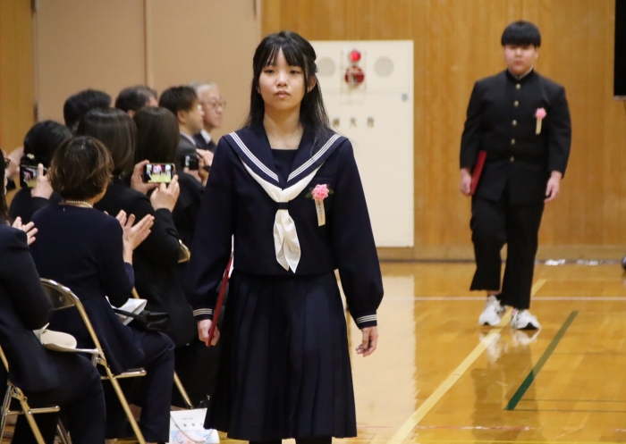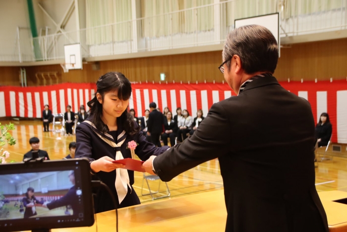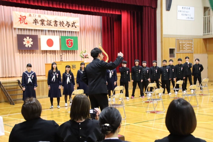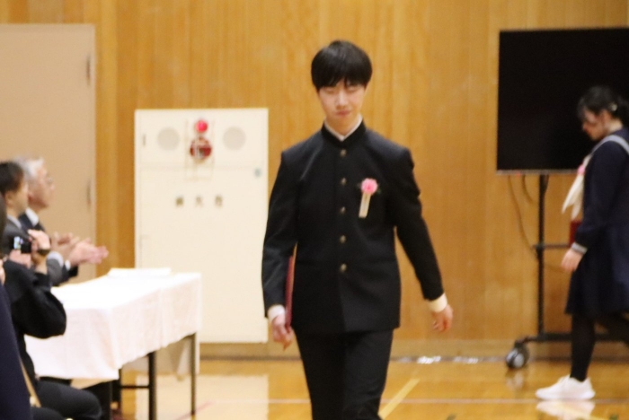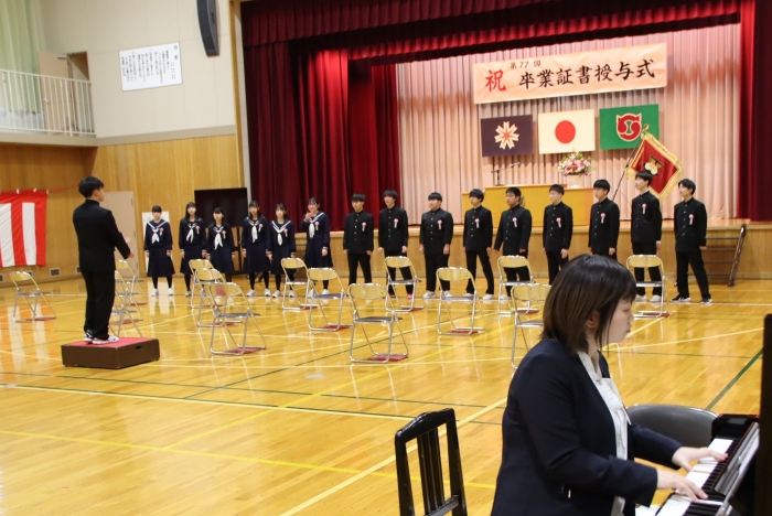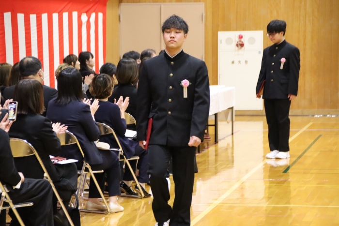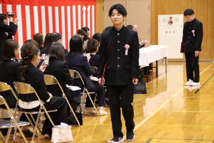 ①第77回卒業証書授与式 2024年03月12日(火) 行事 本日、第77回卒業証書授与式を挙行いたしました。今年度は16名の卒業生が野付中学校を立派に巣立っていきました。 卒業証書授与 校長式辞 卒業生それぞれに16の「ありがとう」 別海町教育委員会祝辞 3年生の数々の功績を称賛くださいました PTA会長式辞 「人は周りの人の助けがあって壁を乗り越えていく」 在校生送辞 3年生へ尊敬の念と感謝の気持ちを伝えます 在校生式歌「星影のエール」 在校生の歌声に涙する卒業生も 卒業生答辞 在校生、教職員、同級生に思いを伝えます。涙が溢れます 卒業生式歌「桜」 式歌「足跡」 卒業生退場 卒業生は教室に戻り、最後の学活です。②へ続きます・・・