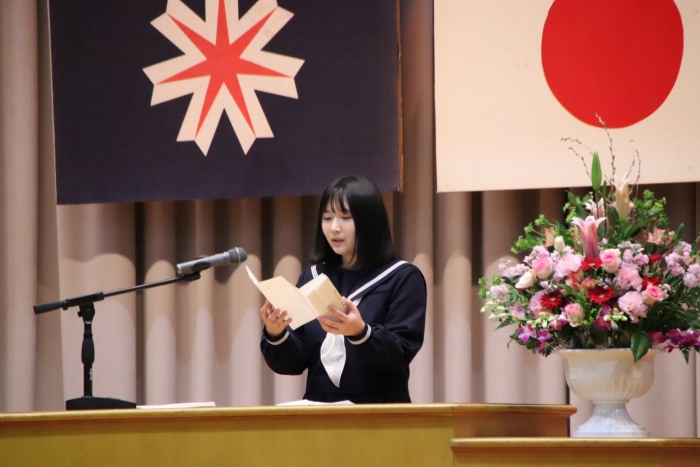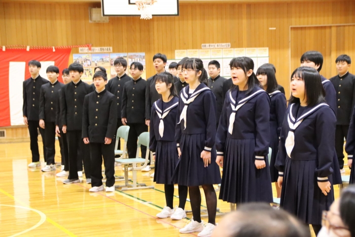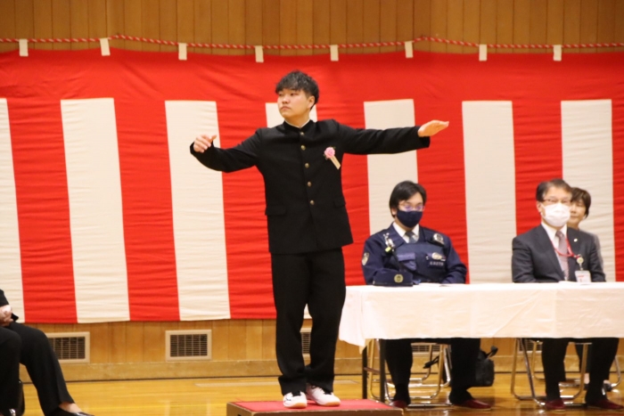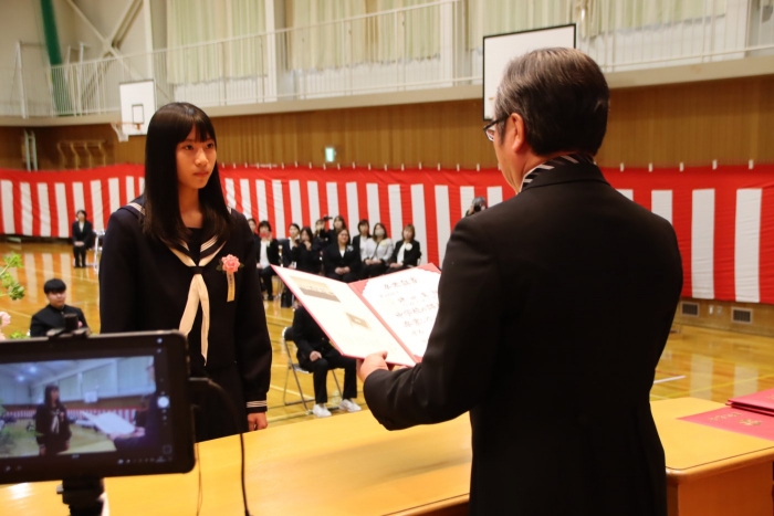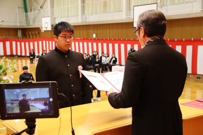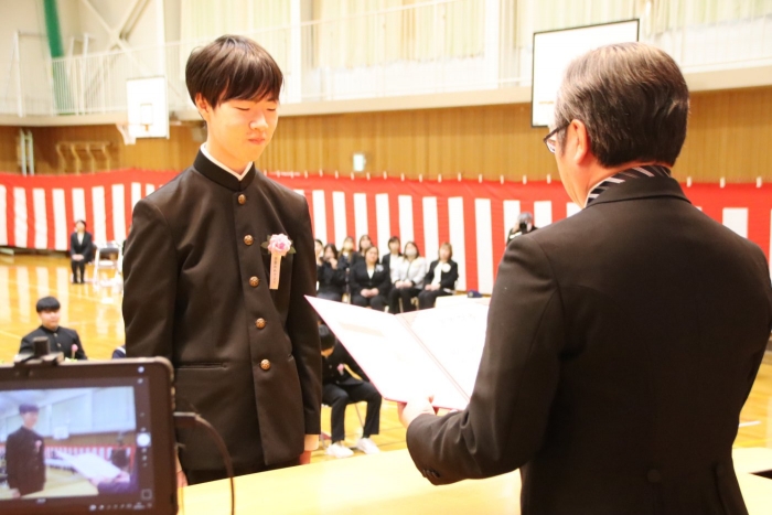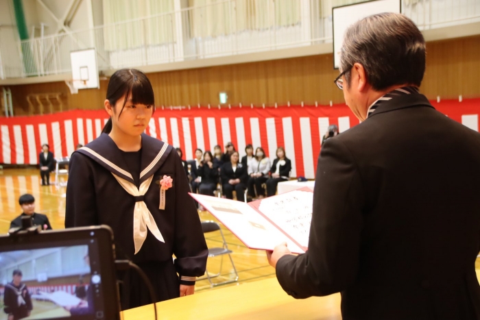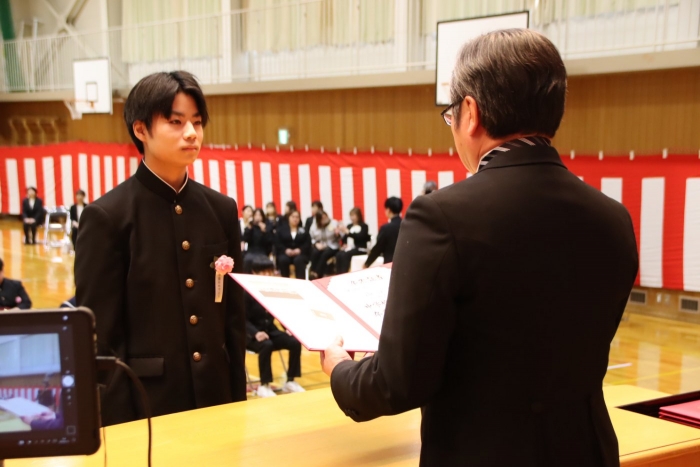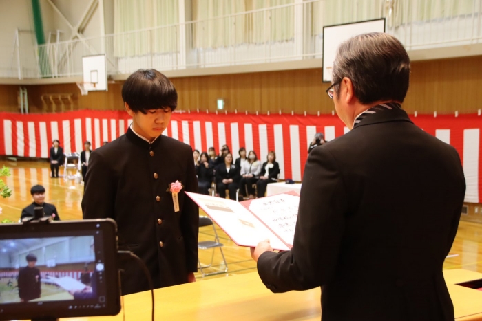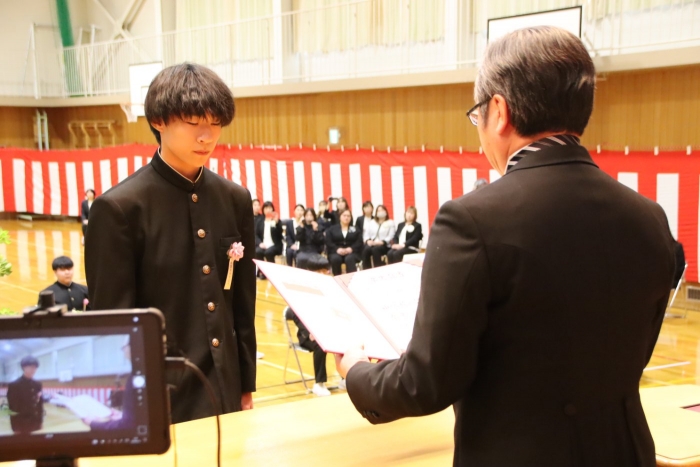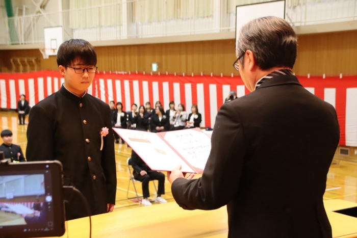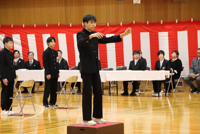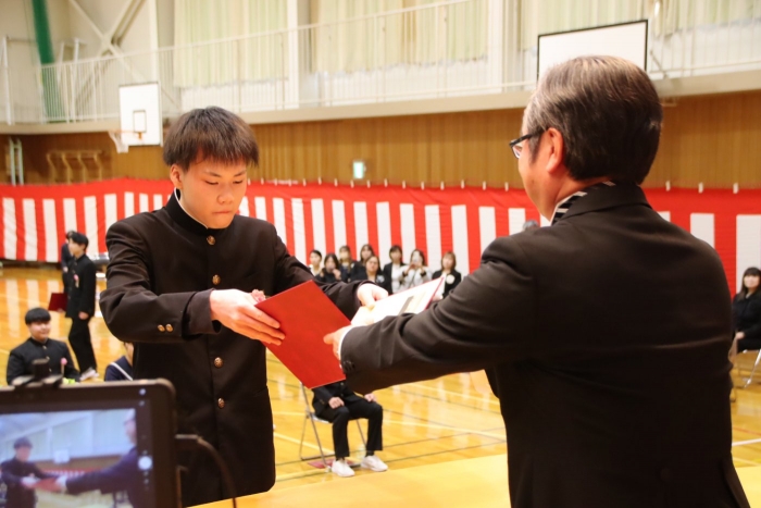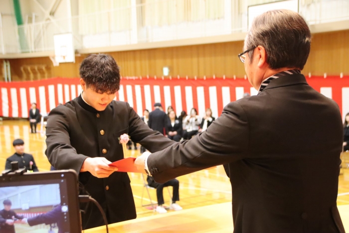 ①第77回卒業証書授与式 2024年03月12日(火) 行事 本日、第77回卒業証書授与式を挙行いたしました。今年度は16名の卒業生が野付中学校を立派に巣立っていきました。 卒業証書授与 校長式辞 卒業生それぞれに16の「ありがとう」 別海町教育委員会祝辞 3年生の数々の功績を称賛くださいました PTA会長式辞 「人は周りの人の助けがあって壁を乗り越えていく」 在校生送辞 3年生へ尊敬の念と感謝の気持ちを伝えます 在校生式歌「星影のエール」 在校生の歌声に涙する卒業生も 卒業生答辞 在校生、教職員、同級生に思いを伝えます。涙が溢れます 卒業生式歌「桜」 式歌「足跡」 卒業生退場 卒業生は教室に戻り、最後の学活です。②へ続きます・・・