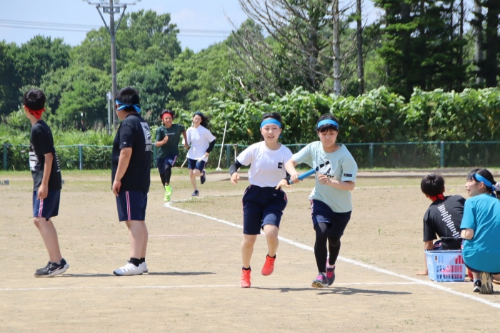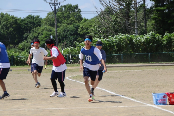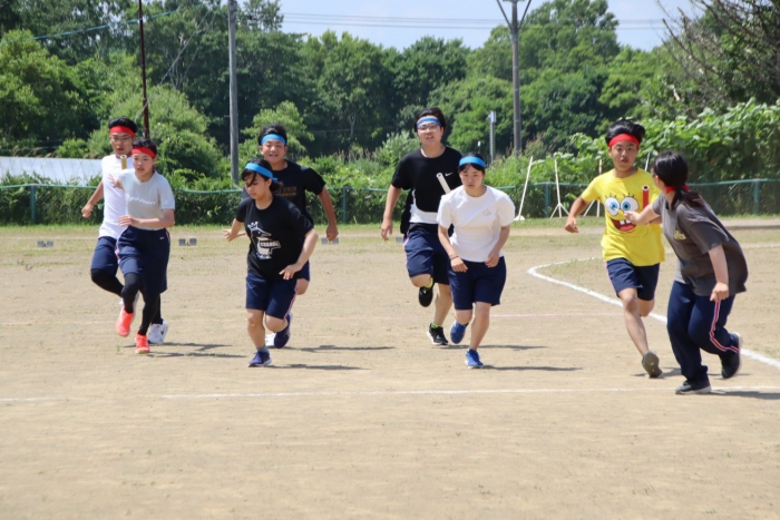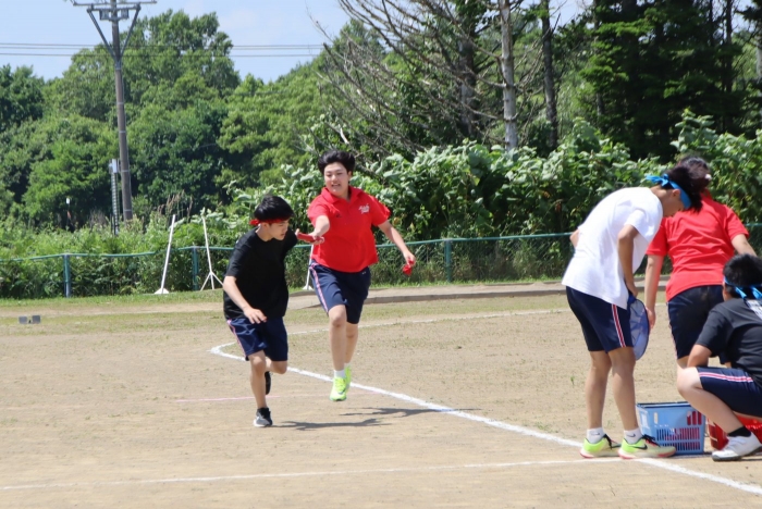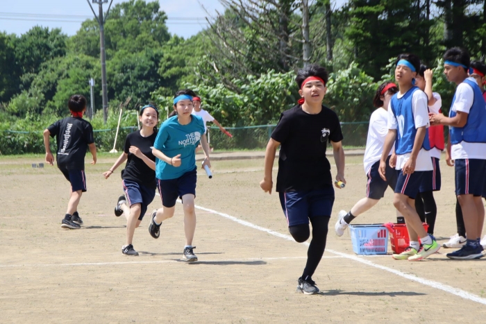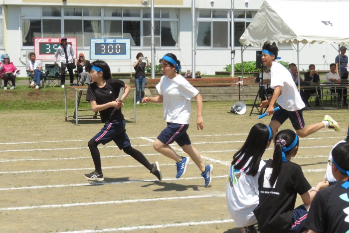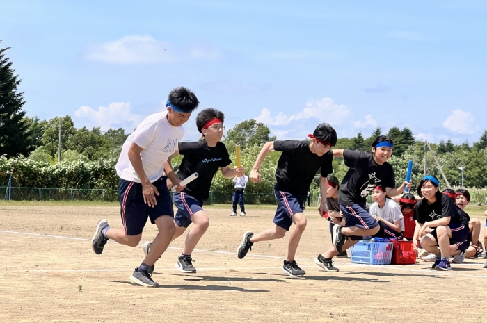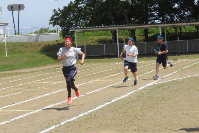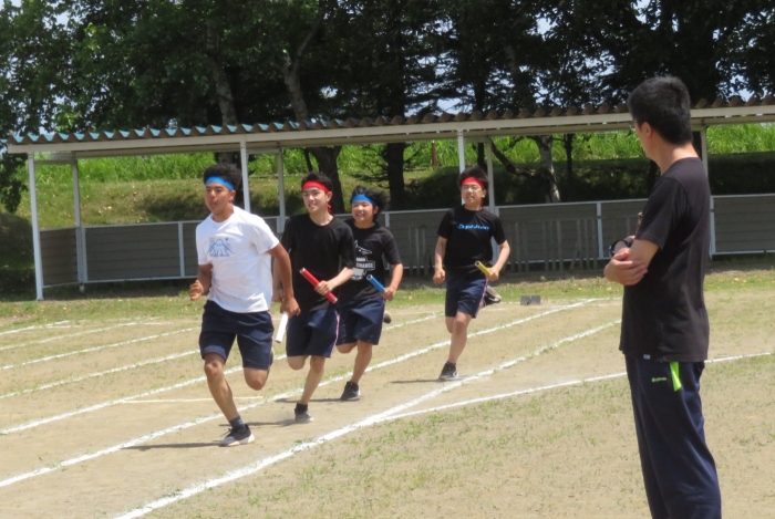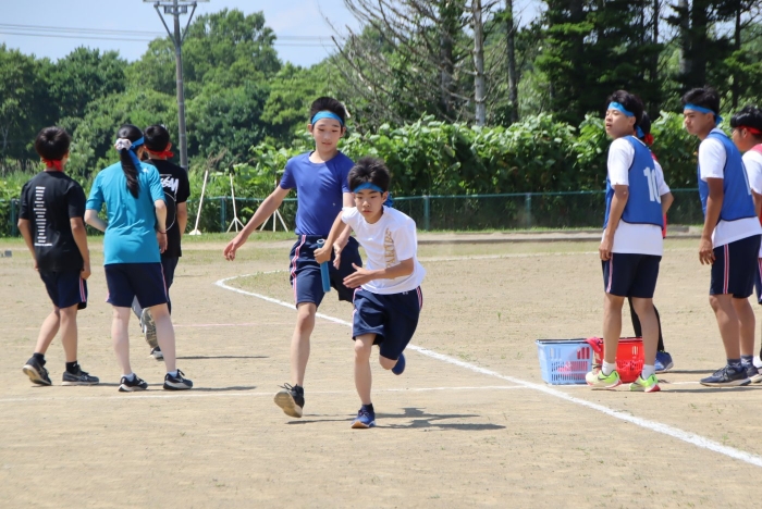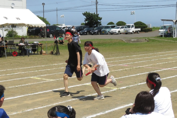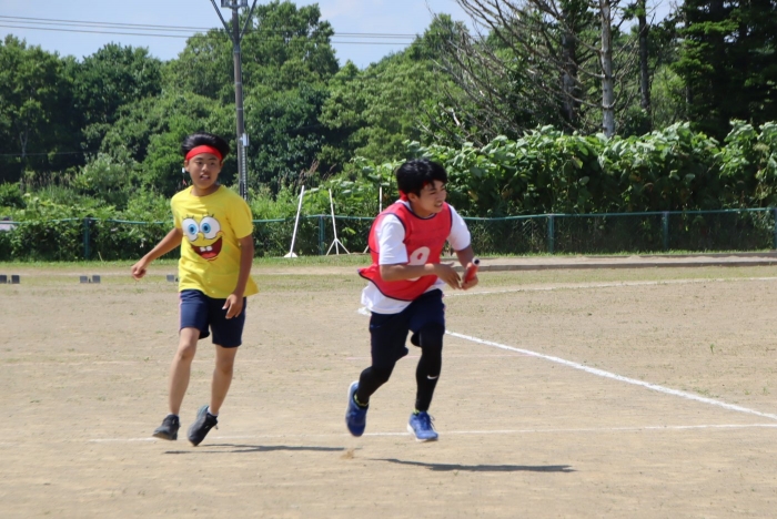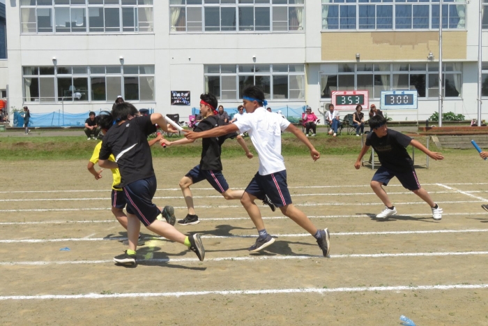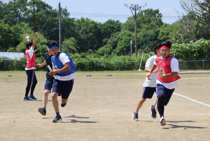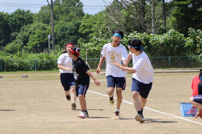体育祭⑥(全員リレー) 2024年07月24日(水) 行事 #体育祭 体育祭の最終種目、赤組青組対抗「全員リレー」。グラウンドには大きな声援が飛び交います。 第一走者がスタート! バトンパスが勝利の鍵 いよいよアンカーへ! 熾烈な戦い! 差が開いても最後まであきらめずに全力疾走! ⑦へ続きます・・・