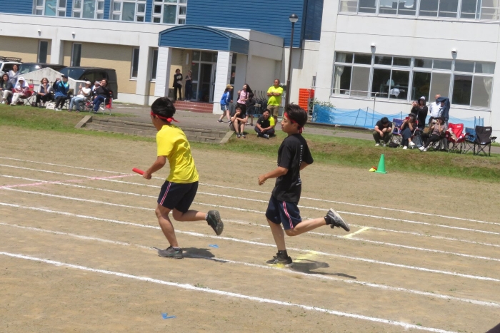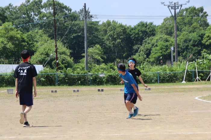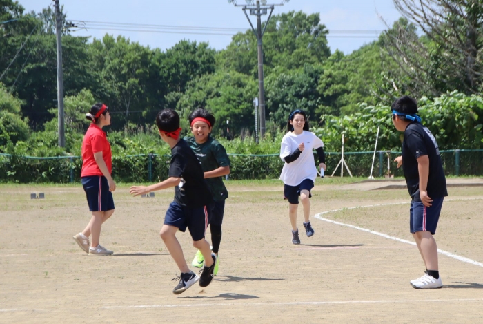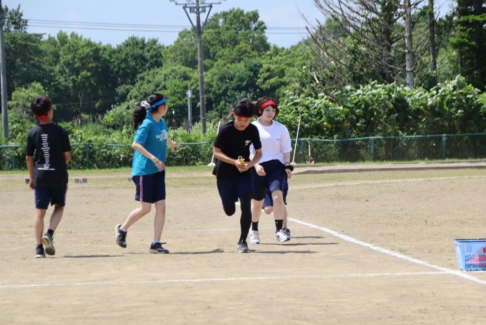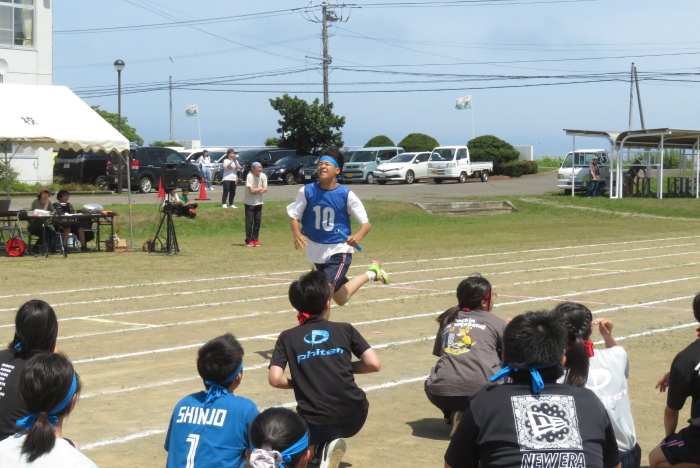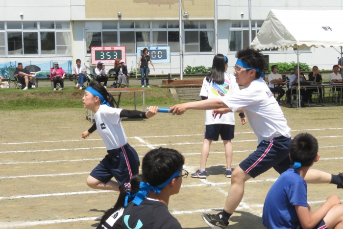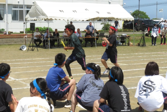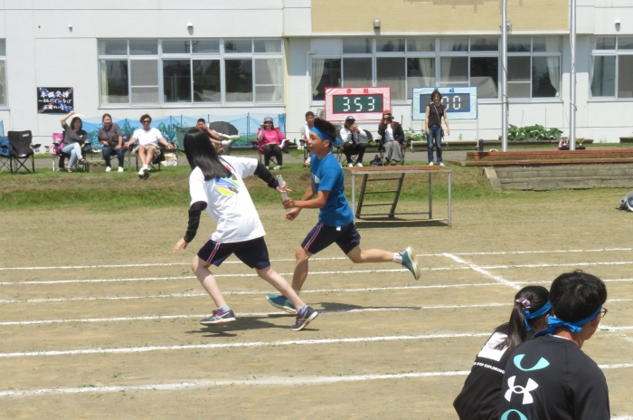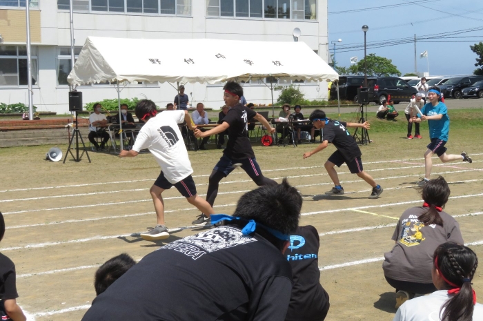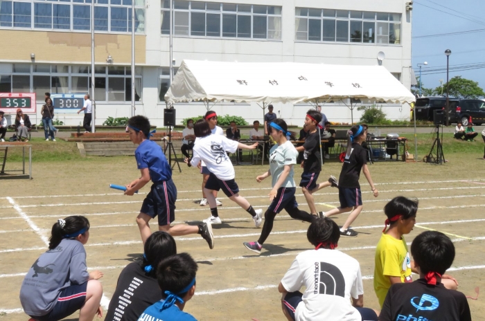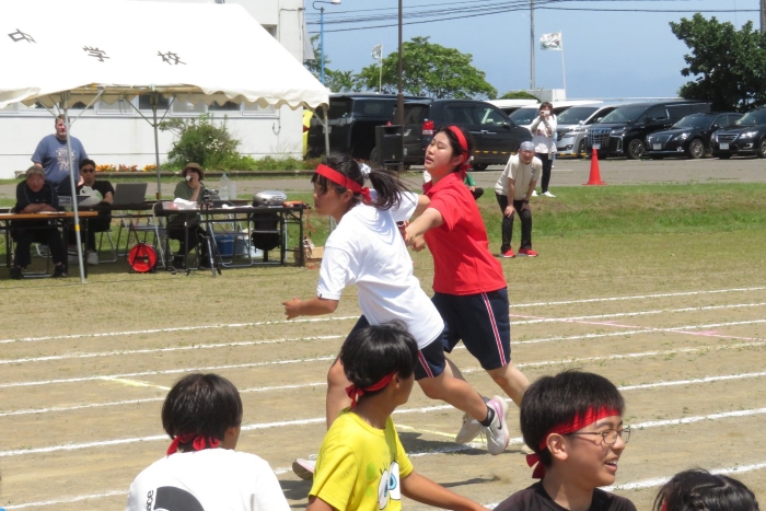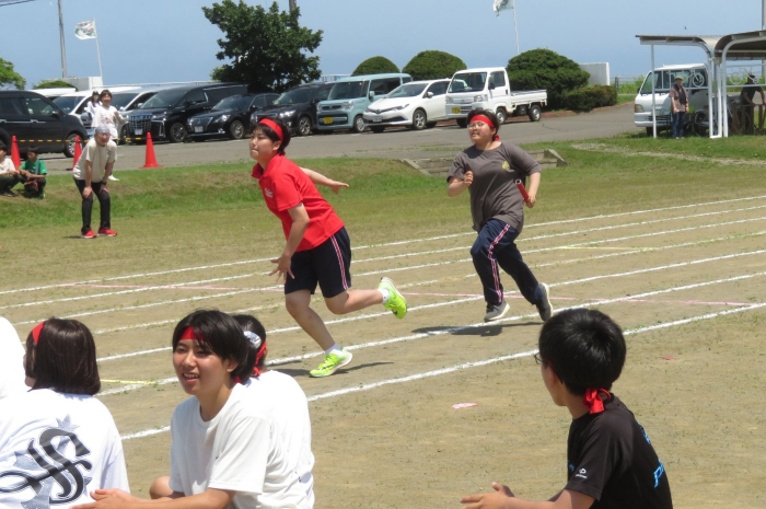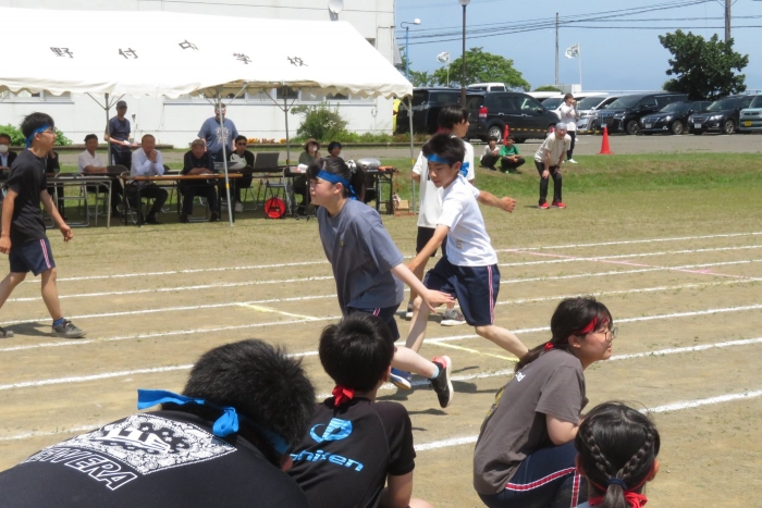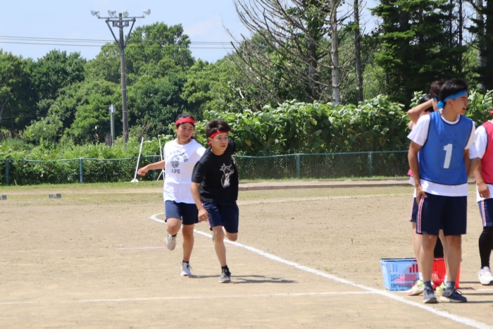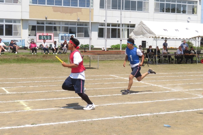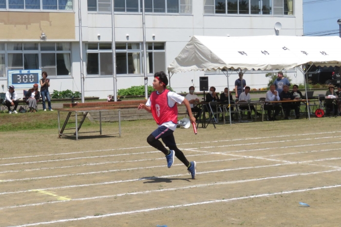 体育祭⑥(全員リレー) 2024年07月24日(水) 行事 #体育祭 体育祭の最終種目、赤組青組対抗「全員リレー」。グラウンドには大きな声援が飛び交います。 第一走者がスタート! バトンパスが勝利の鍵 いよいよアンカーへ! 熾烈な戦い! 差が開いても最後まであきらめずに全力疾走! ⑦へ続きます・・・