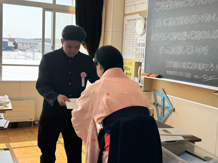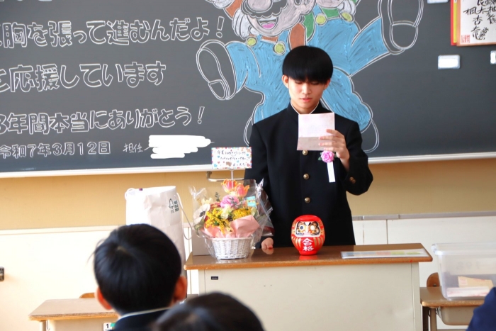 担任は涙ぐみながら、最後の学級通信を読み上げました。「どんなことでも捉え方で満たされる。そのキーワードは『感謝』。~をありがとうと思うことでポジティブになり、パワーが出る。これからの人生も周りの人への『感謝』=『満たされる心』をもって」と伝えました。