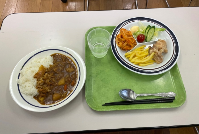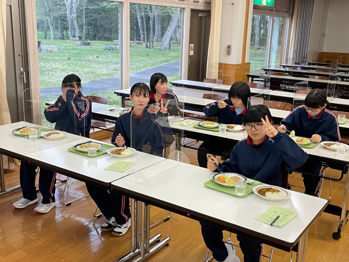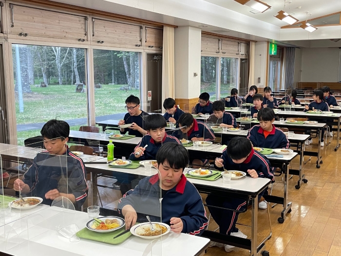 宿泊研修8 2022年05月25日(水) 行事 たっぷりと動き回ったので「お腹ペコペコ」みんなで食堂へ。待ちに待った夕食の時間です。 結構なボリュームではありましたが、誰もカレーをお代わりせず…少食の人たちが多いようです。