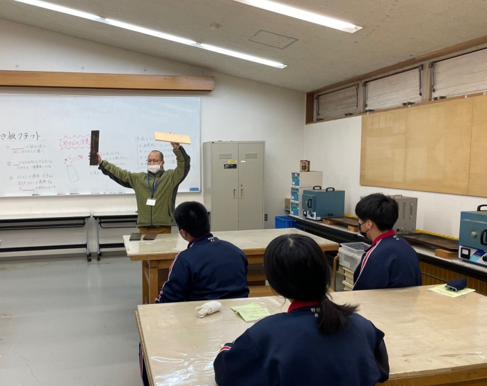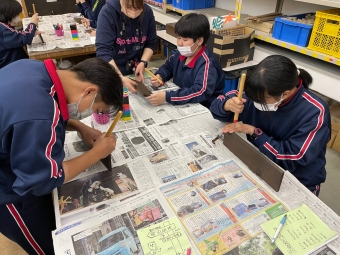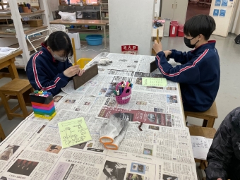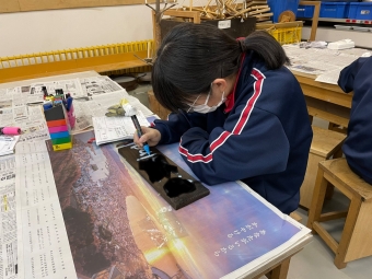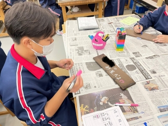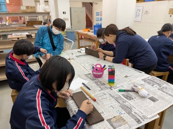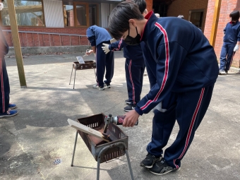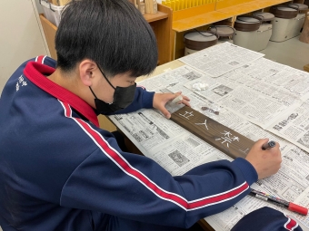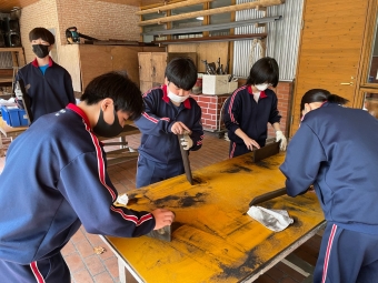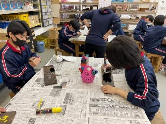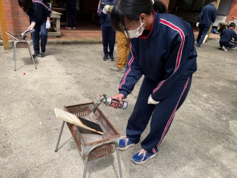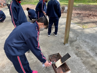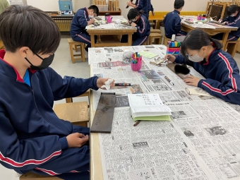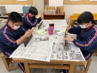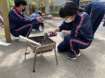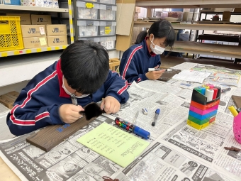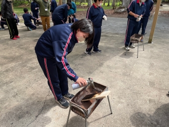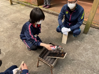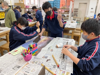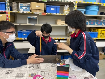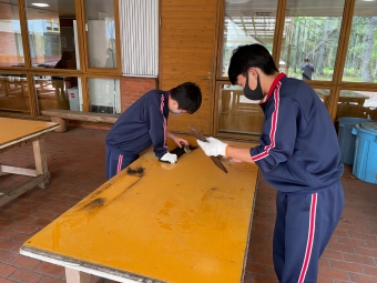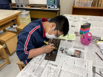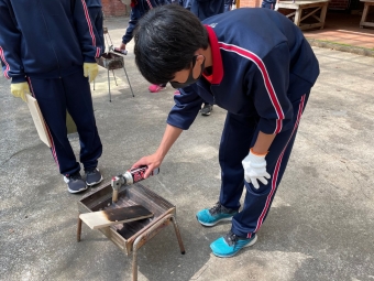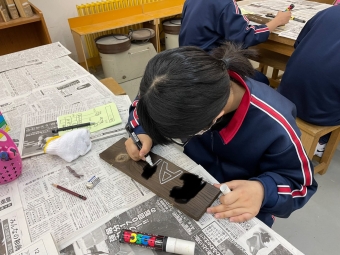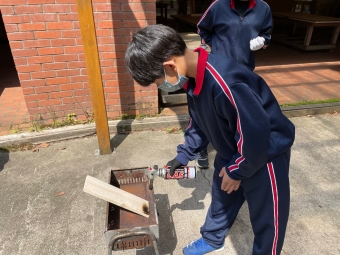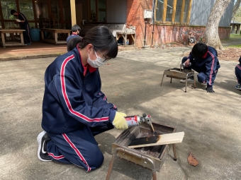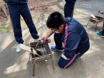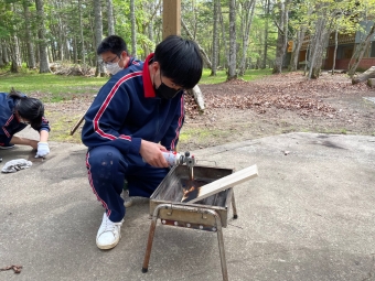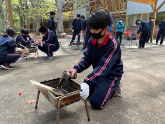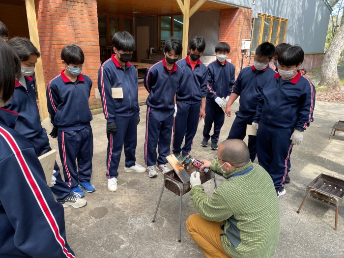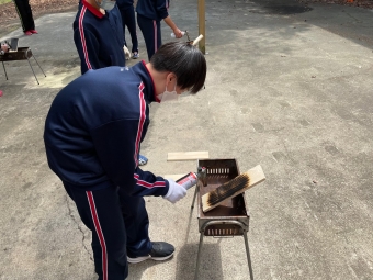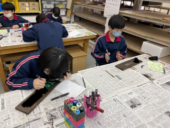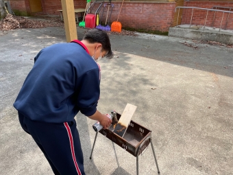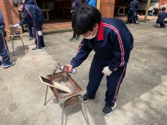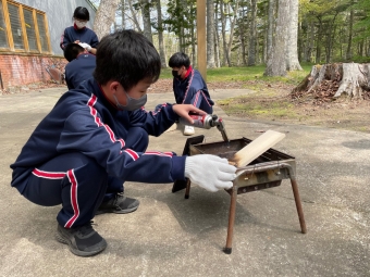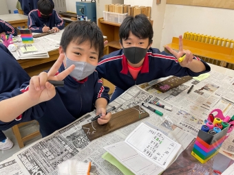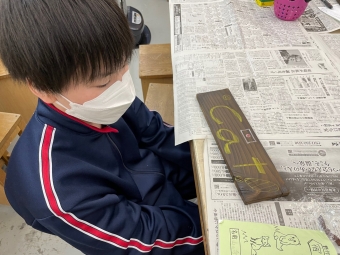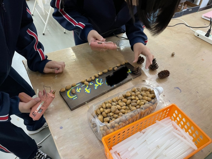 宿泊研修12 2022年05月26日(木) 行事 焼き板クラフトに挑戦!ガスバーナーとグルーガンを使うので火傷注意。 1.バーナーで板を真っ黒になるまで焼きます。 2.焼いた板を磨きます 3.紐を通す穴を開けます。 4.イラストや模様、文字などをポスターカラーで装飾します。 松ぼっくりやどんぐりなどをグルーガンでつけて完成です。 クラスの表示版も完成。16個のどんぐりで装飾しました。