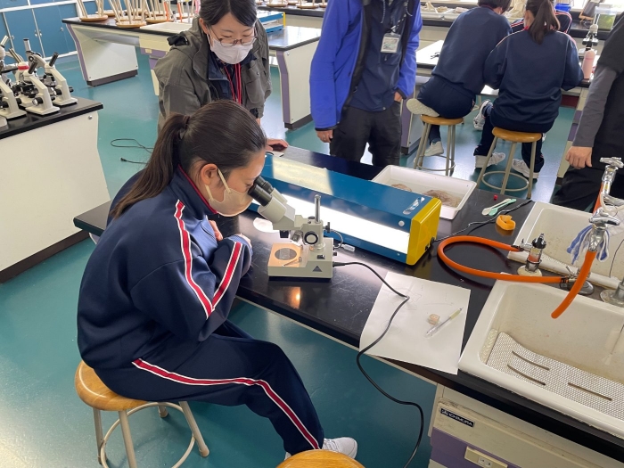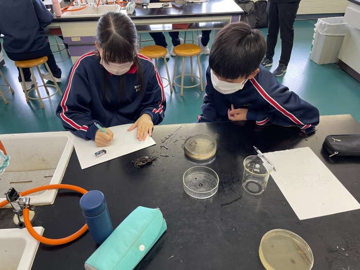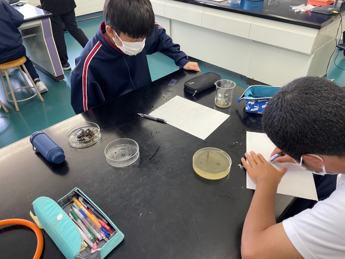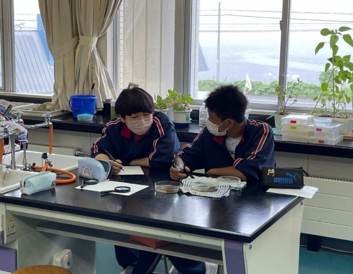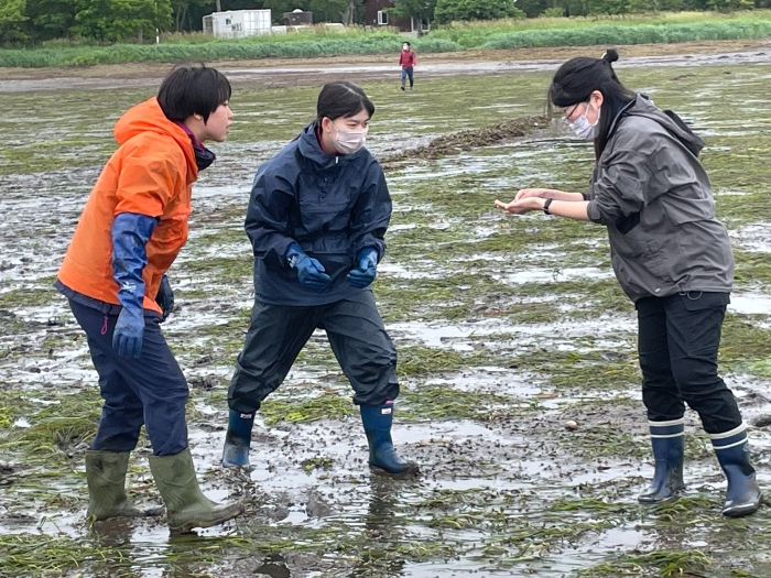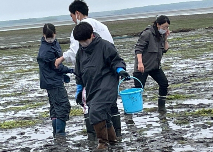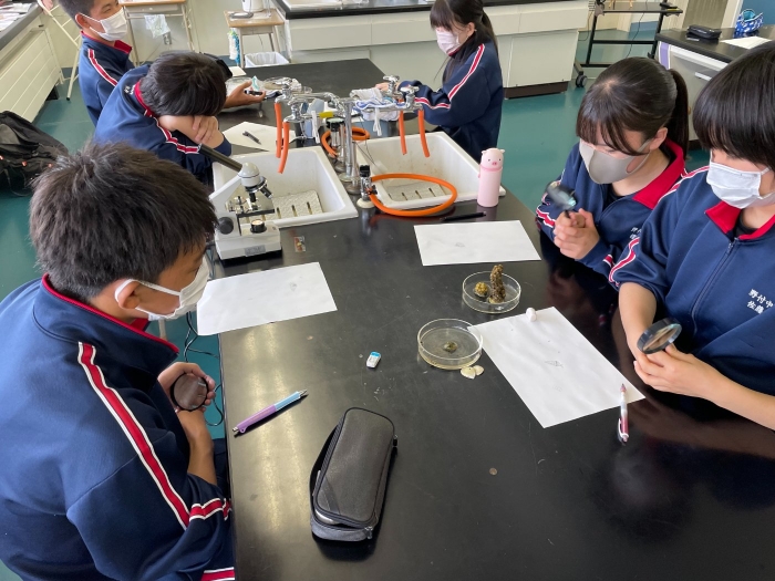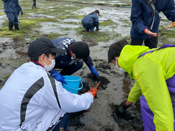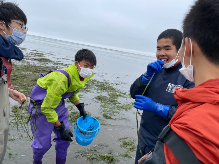 アマモ学習 2022年07月14日(木) 行事 今日は野付学の「アマモ学習」を3年生にて実施しました。野付ネイチャーセンターから2人の講師を招き、アマモの生態系について学びを深めました。 まずはアマモについて学びます アマモを食べる動物もいます アサリが採れる干潟ですが…今日はその他の生物を探します クラゲがお気に入りのようです アマモだけに噛むと甘いらしい… 学校に戻り、アマモ周辺にいた生物について観察しスケッチしました 顕微鏡でも調べてみます アマモだけでなく、アマモをとりまく生態系についても学習し、たくさんの生物に触れ、知識を深めることができた1日でした。