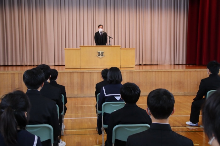 校長先生のお話。今年1年、一生懸命な姿を見せてくれたことに対して、感謝の言葉を述べられました。皆さんが必死に頑張る姿は「かっこいい」し、その姿を見れたことが教師の幸せです。また、次年度へ向けての宿題を出され、「どんなことでもよいので目標をもつこと。そしてどのような『かっこいい自分』を目指すか考えてきてほしい」と伝えられました。