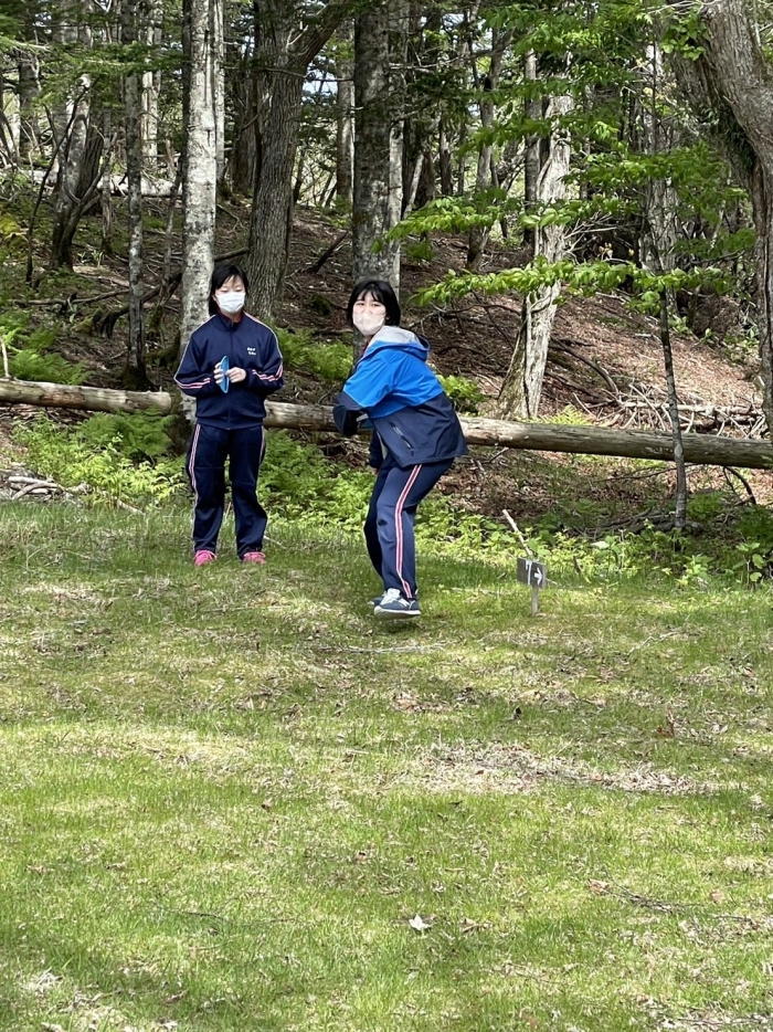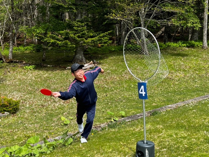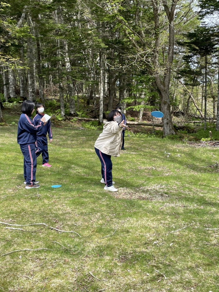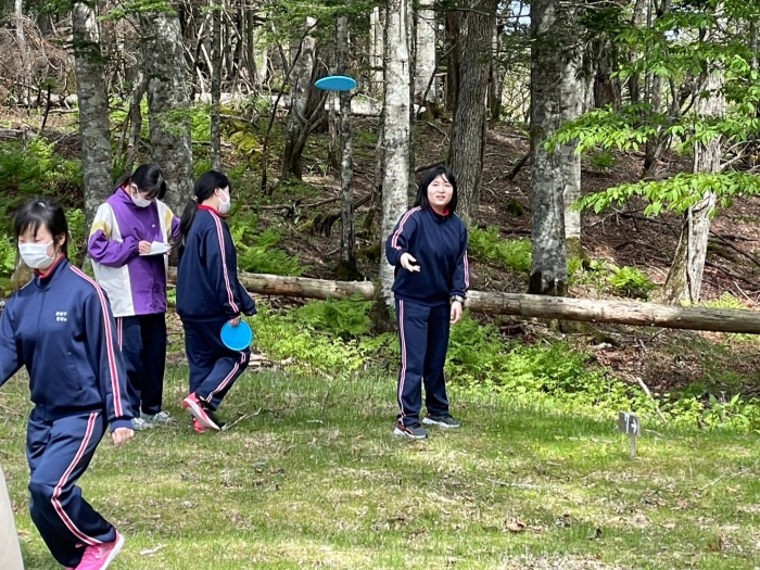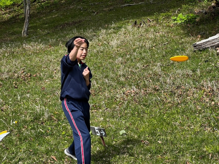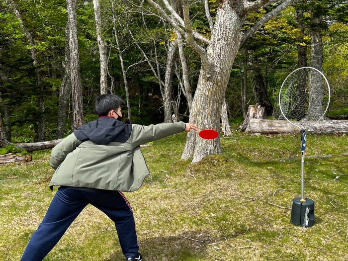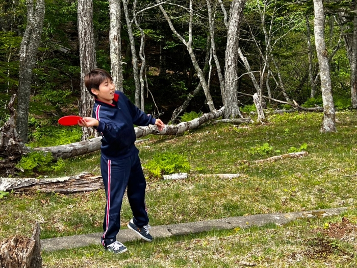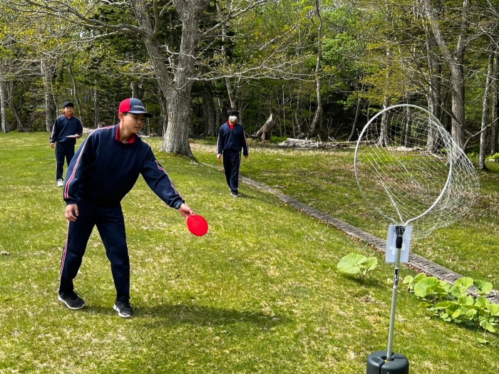 フリスビーを使った的あてゴルフに挑戦。広い敷地のいたるところから大きな声が響いていました。